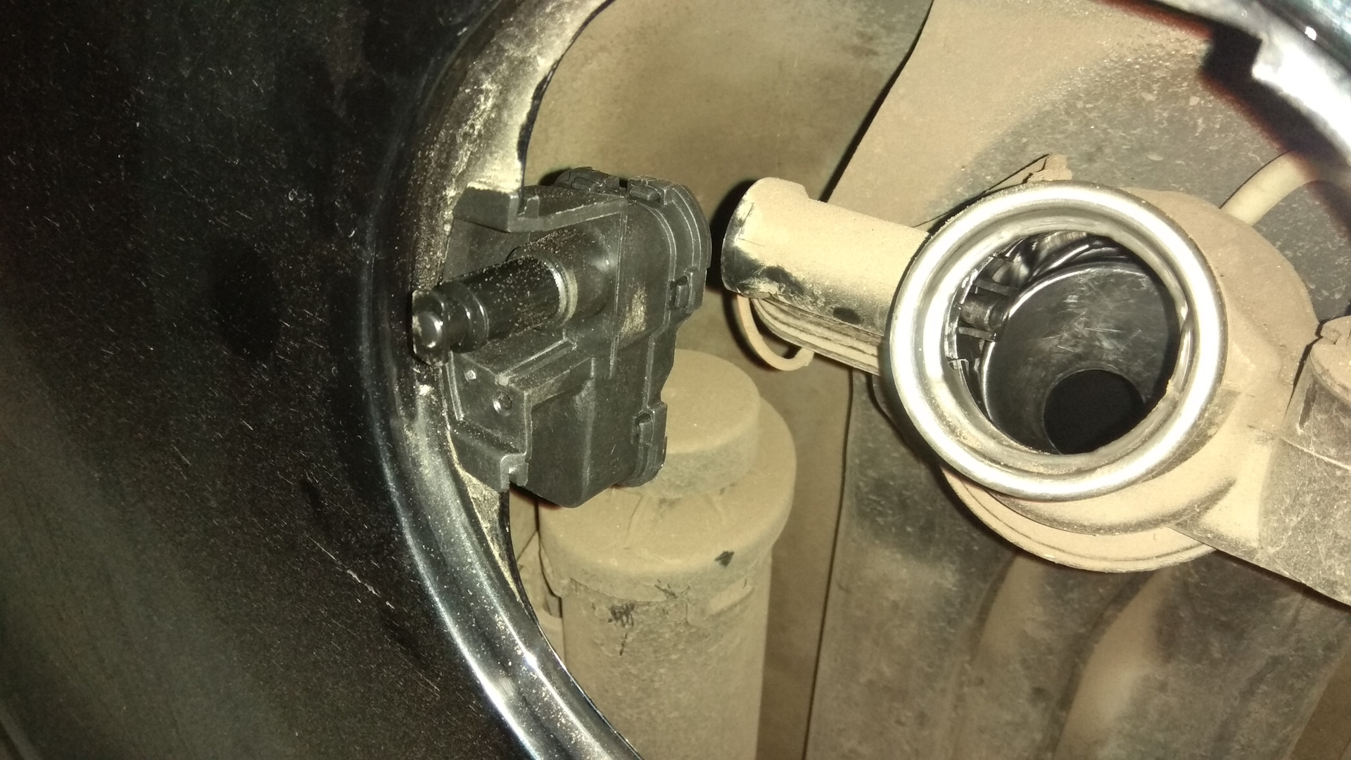 Сам фиксатор с кнопкой, толкающий и фиксирующий лючок, остался заблокирован. Нажимаем на кнопку — открывается. Проверил ещё раз. Лючок без проблем открывается и закрывается. "Победа!" — воскликнул я. Довольный сел за руль автомобиля и поехал на заправку. Но по приезду на Лукойл лючок опять не открывается. Как же так? Ведь только что всё работало. На месте выяснилось, что если лопаткой открыть лючок бензобака, то он потом открывается и закрывается нормально до тех пор, пока не поставишь машину на сигнализацию. После установки охранного режима и повторного снятия с него, лючок открываться не будет!