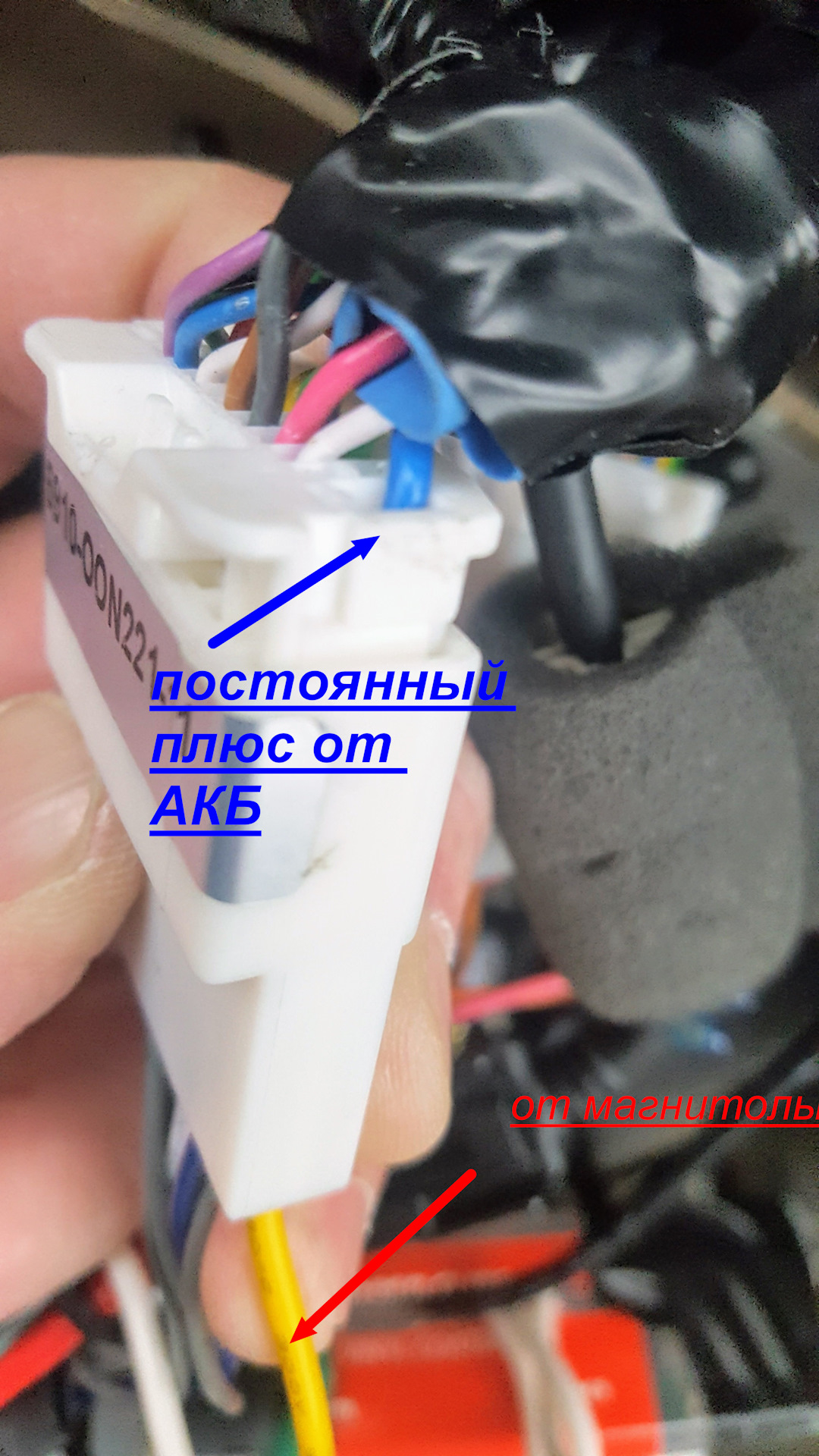Питание, если вы хотите чтобы она работала очень долго, возьмите с желтого провода идущего от магнитолы на штатный разъем и переходящий на штатный синий.