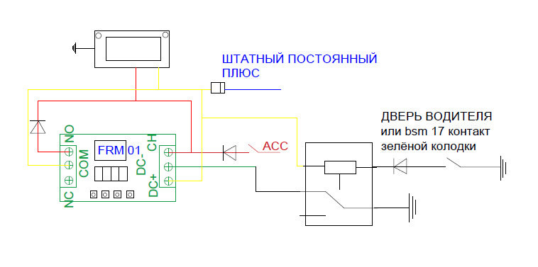 Подробней какой от куда брал провод. Маркировку не помнишь? У меня есть 1N 4007 вроде должны подойти. Провод АСС вынул из колодки или в разрыв? Если есть штатный постоянный плюс по чему не через него подключил? Где это все закрепил? Если зажигание автоматически выключится все так же работает пока дверь не откроешь?