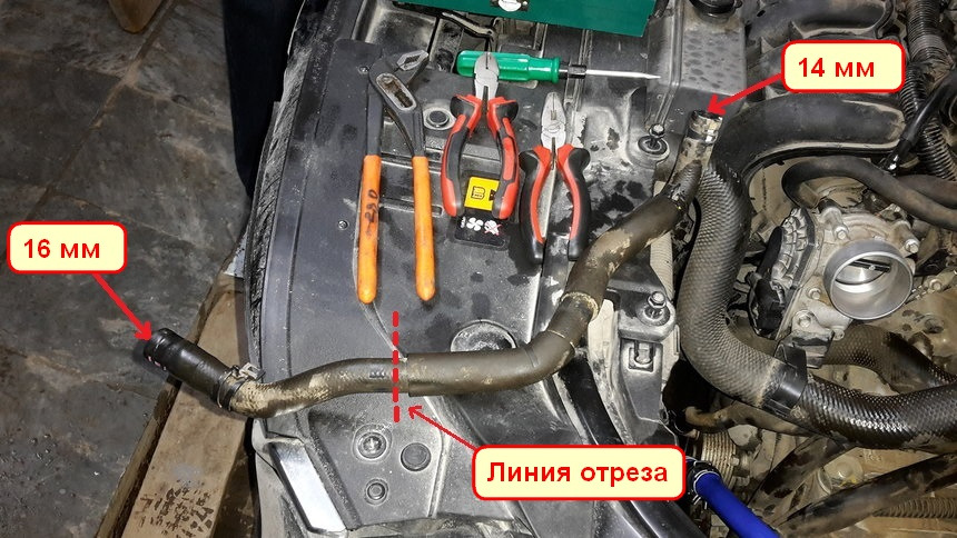 Благо у отца в гараже много всякой всячины и был найден стыковочный ёрш на 18мм, который с трудом залез в штатный патрубок. Поэтому купите ерш переходник 16/14 мм. (позже куплю такой и заменю).