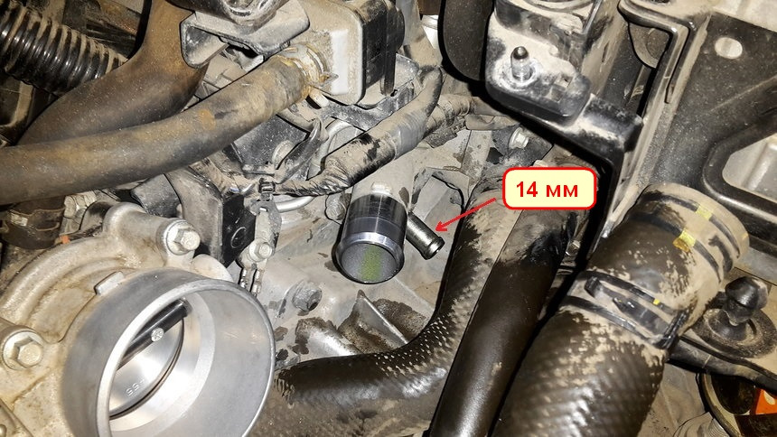 На стадии подготовки к установке я замерял диаметр штуцера на теплообменнике. Получилось 16мм. Поэтому был куплен шланг на 16 мм. Планировал полностью снять штатный патрубок и заменить его силиконовым с термостатом. Но в процессе установки выяснилось, что на теплообменнике штуцер был 16 мм, а ответный на распределительном узле 14 мм! То есть полностью заменить штатный патрубок этим силиконовым не получается! Необходимо ершом стыковаться со штатным