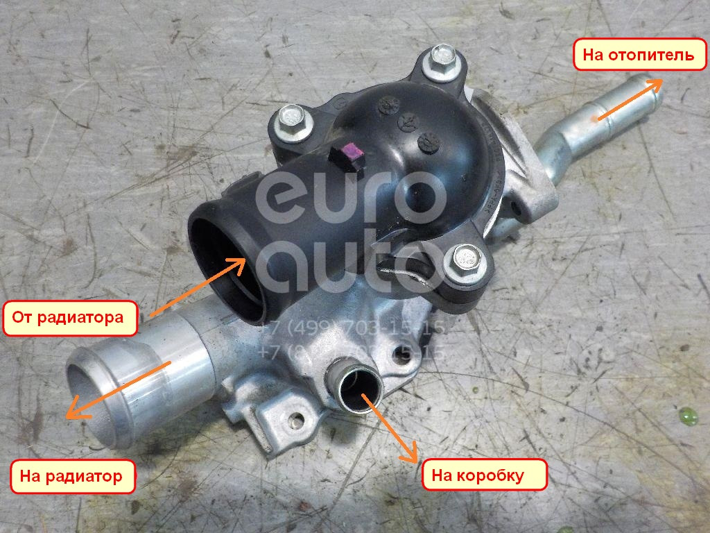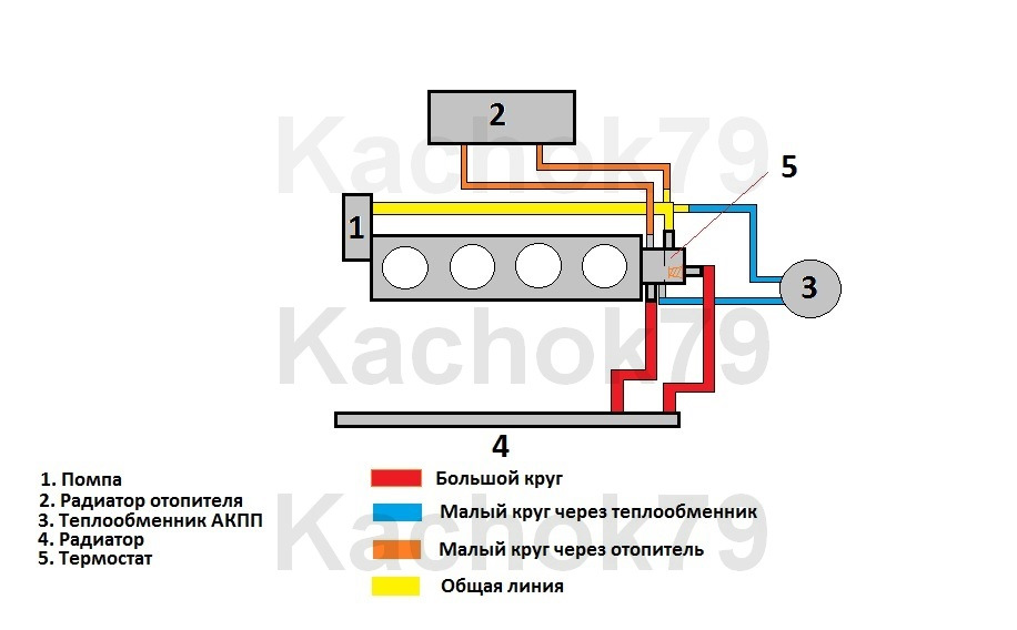 В нем антифриз разделяется на три потока — один идет через теплообменник АКПП в желтую (см. схему) общую линию, второй через радиатор отопителя так же в желтую линию, и третий через открытый термостатом канал (байпас) в ту же общую линию. Вот тот коллектор, обозначенный желтым цветом на схеме