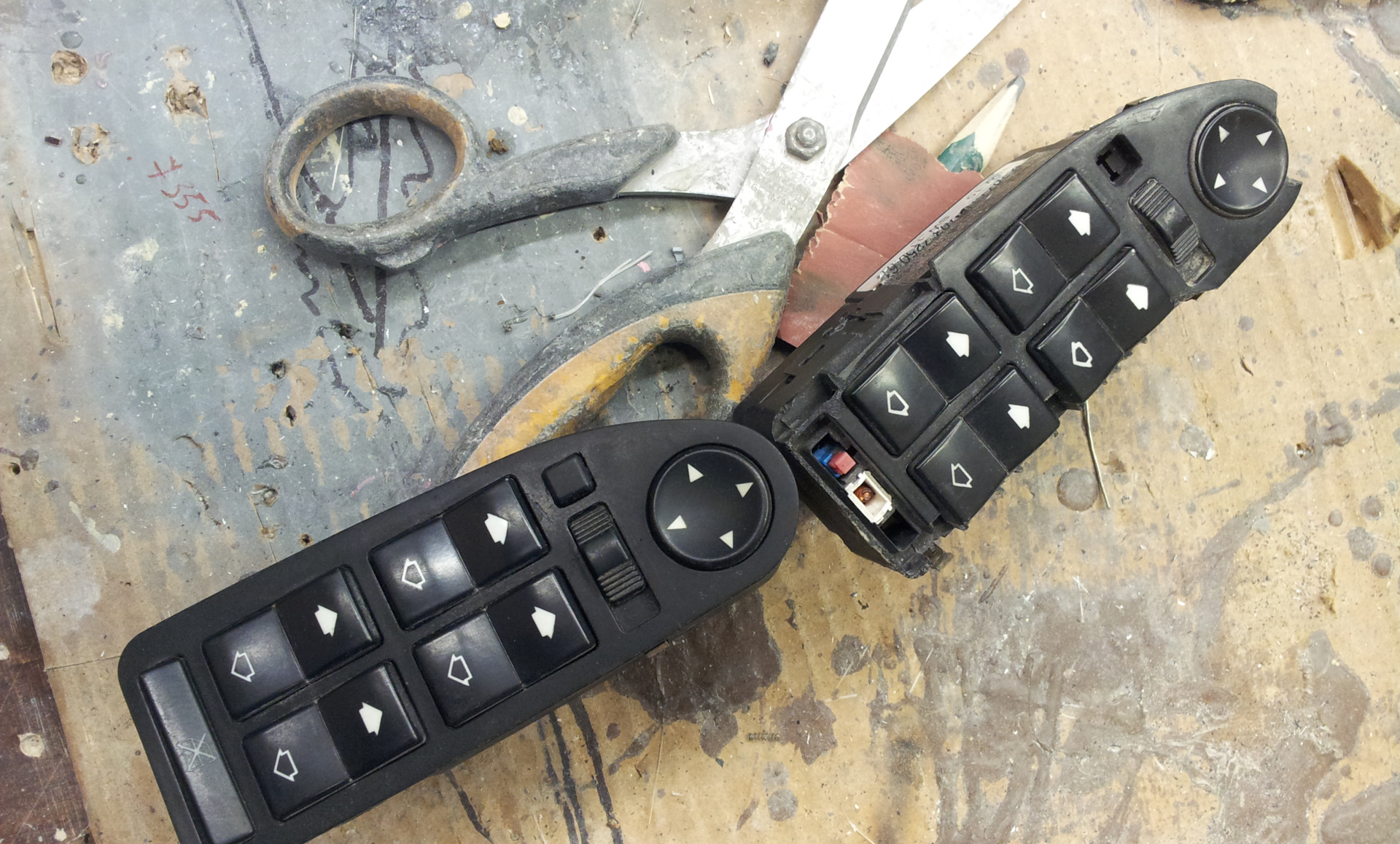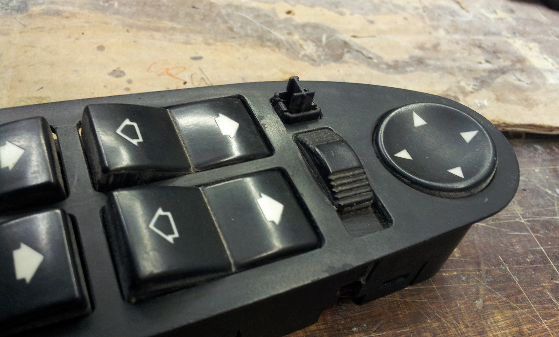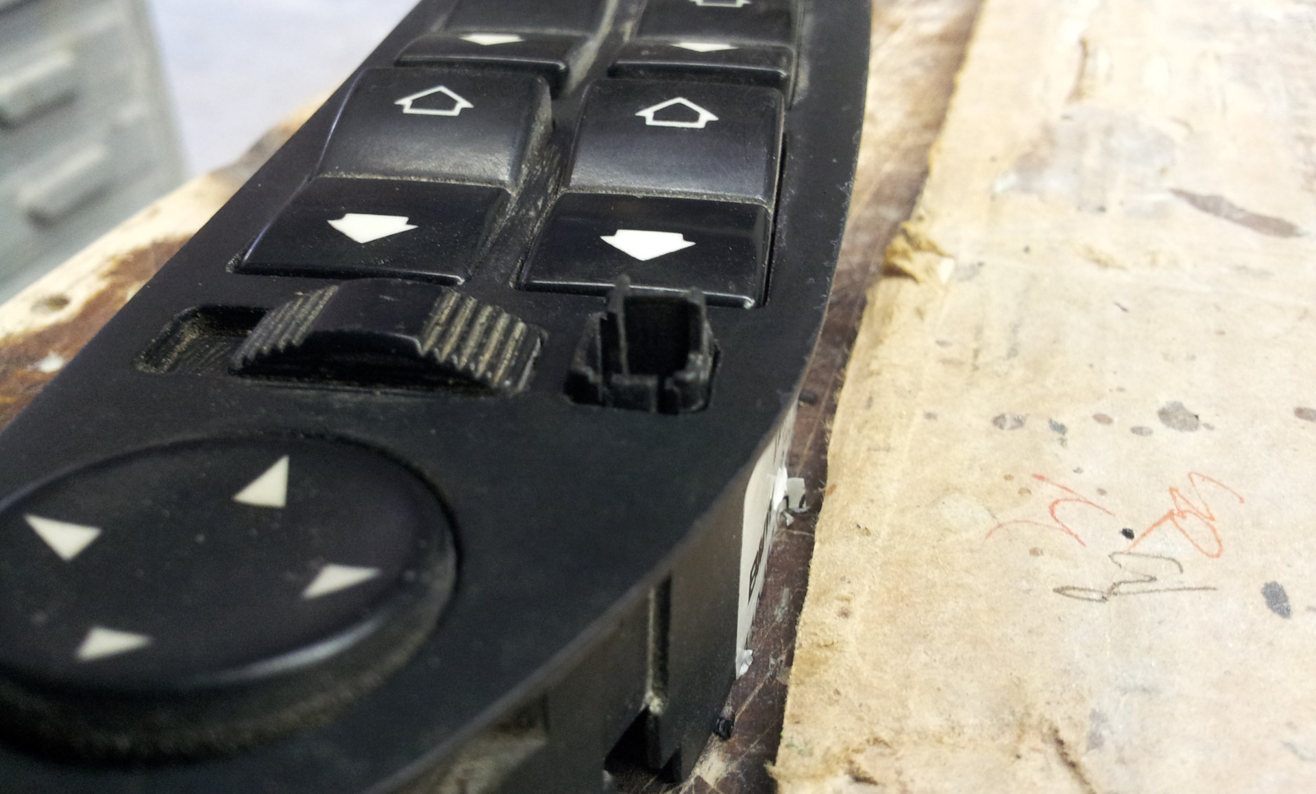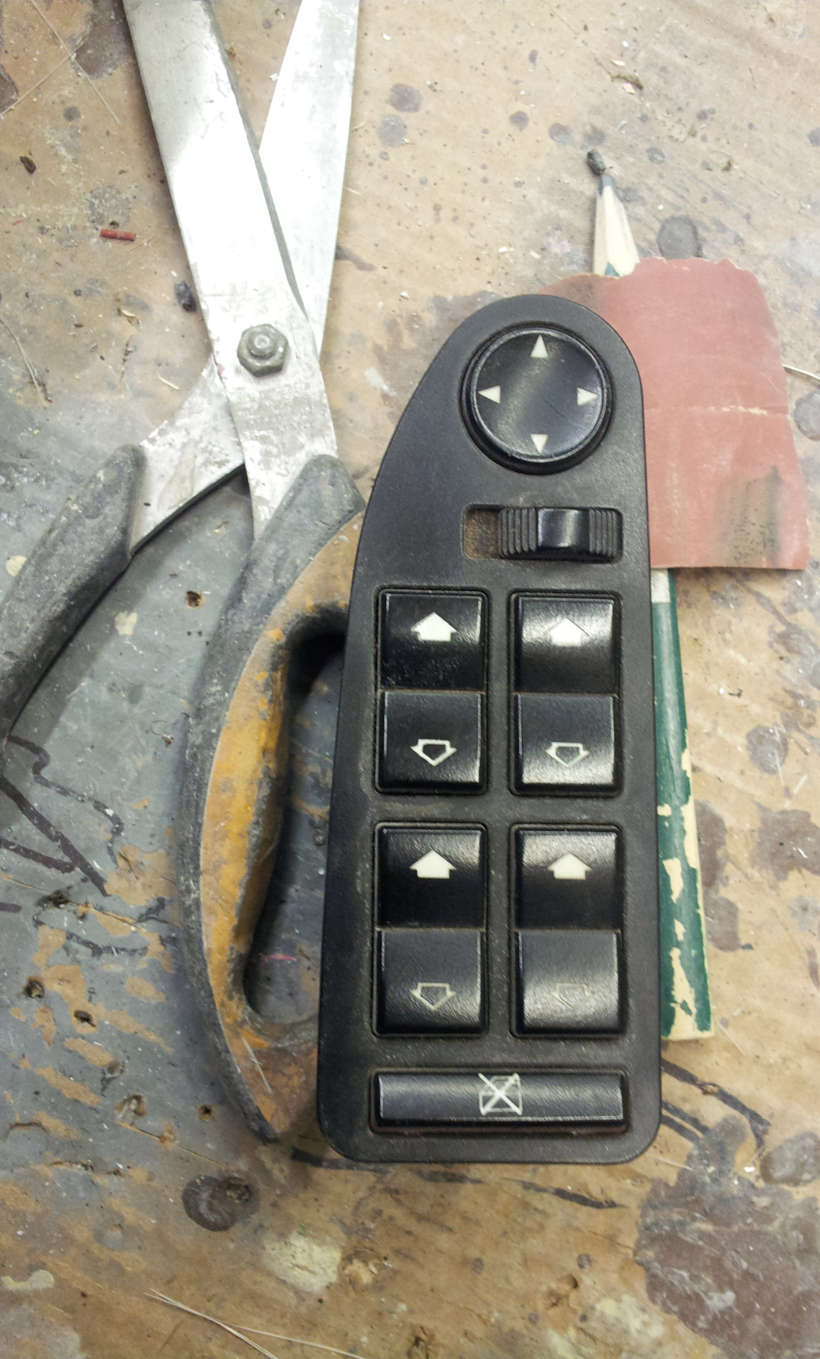 Уже не вспомню откуда у меня взялся блок управления зеркалами и стеклоподъёмниками. Но пролежал он у меня в закромах лет 5 или 6. Блок это был с кнопкой складывания зеркал. Но поскольку зеркала у меня в принципе не складываемые( пока…), да и сам блок убитый напрочь визуально, то скорей всего я его на шроте как довесок взял :)