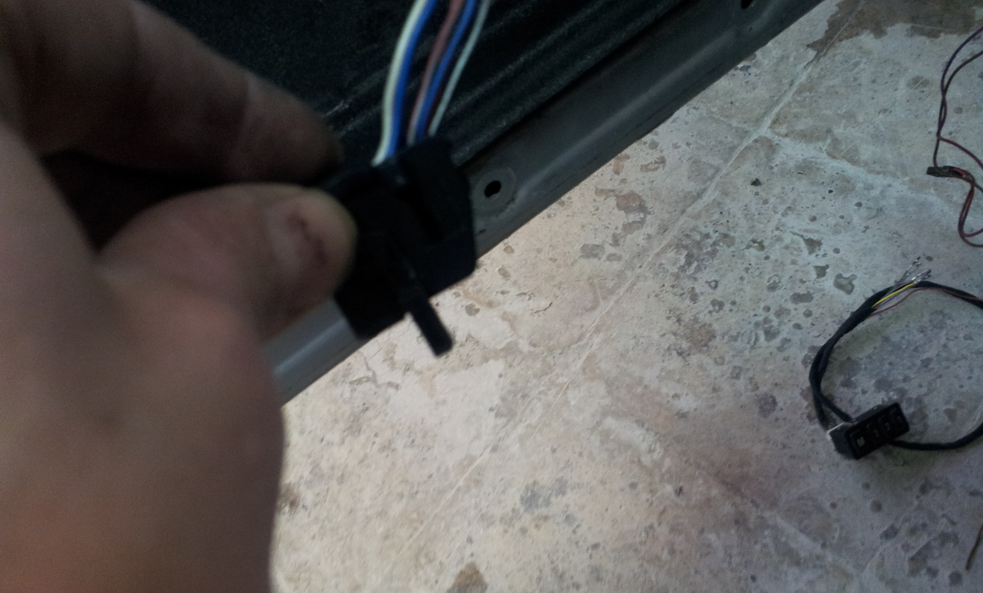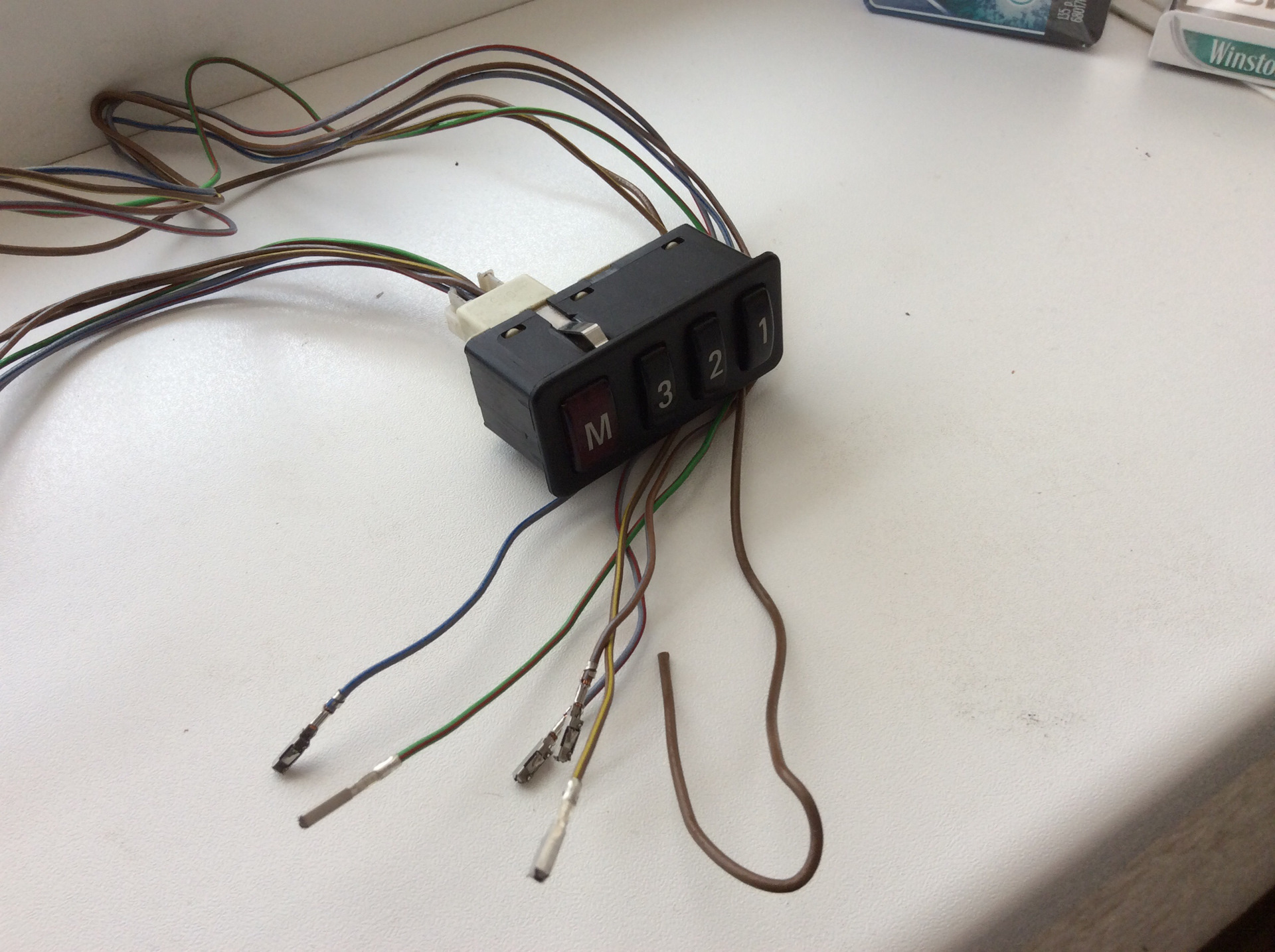 По схеме БМВ от неё идёт короткий пучок проводов соединяющий её с блоком кнопок стеклоподъёмников. У меня нет этого пучка( но кнопку я купил :). Поэтому сам делаю пучок руководствуясь схемой и использую по возможности нужную цветовую проводку и пины с проводки купленной несколько лет обратно и постоянно её кромсая.
