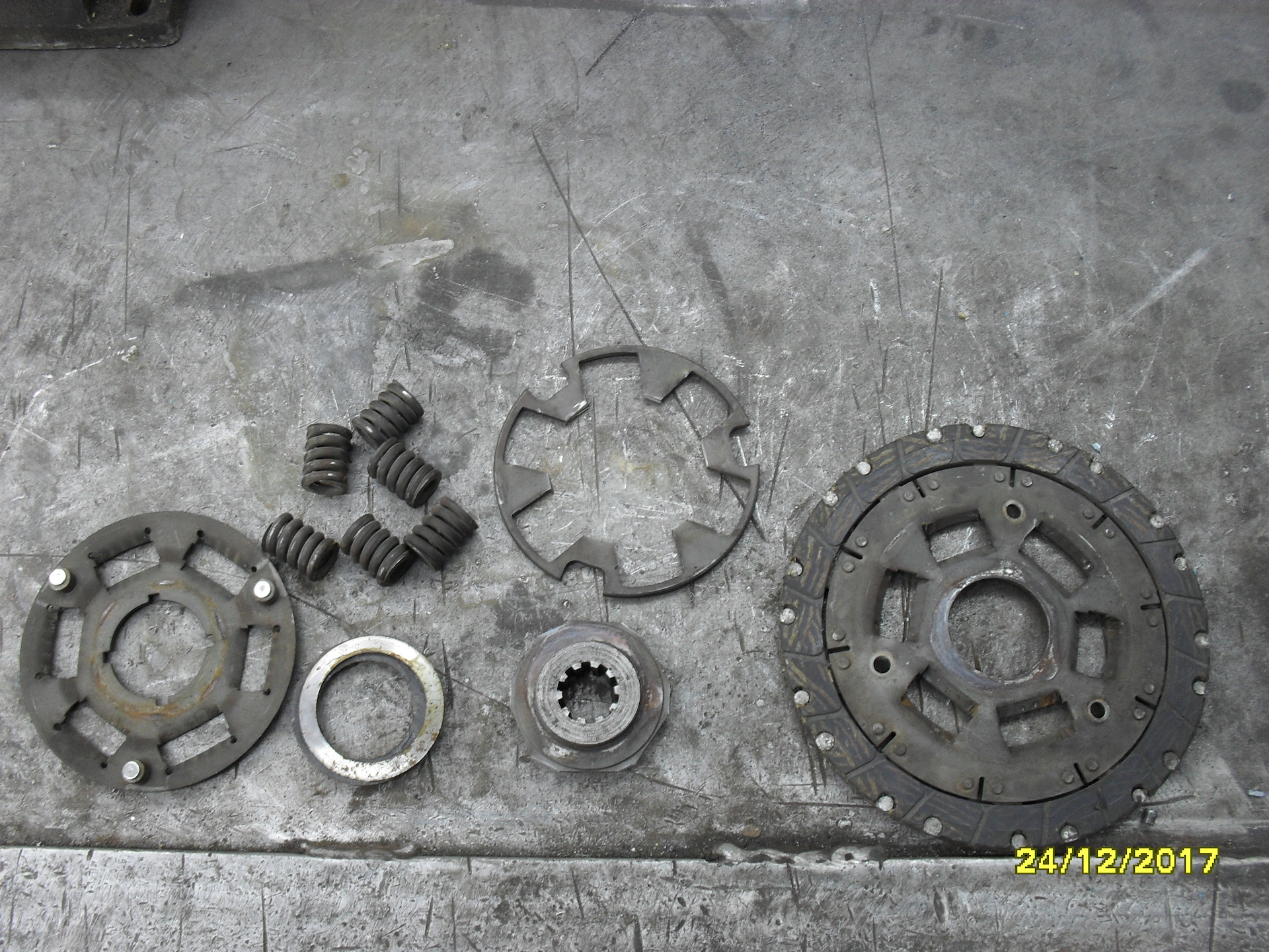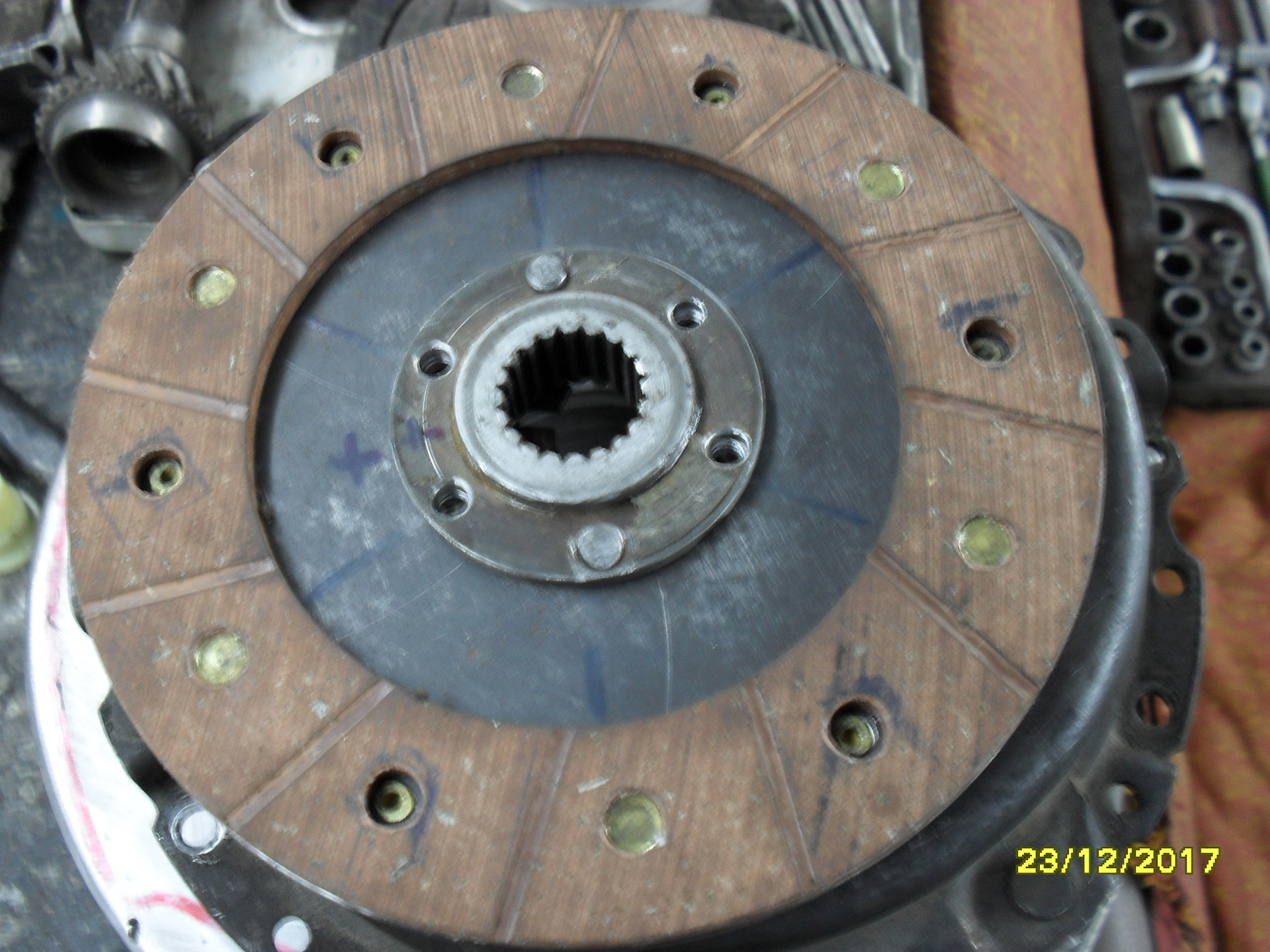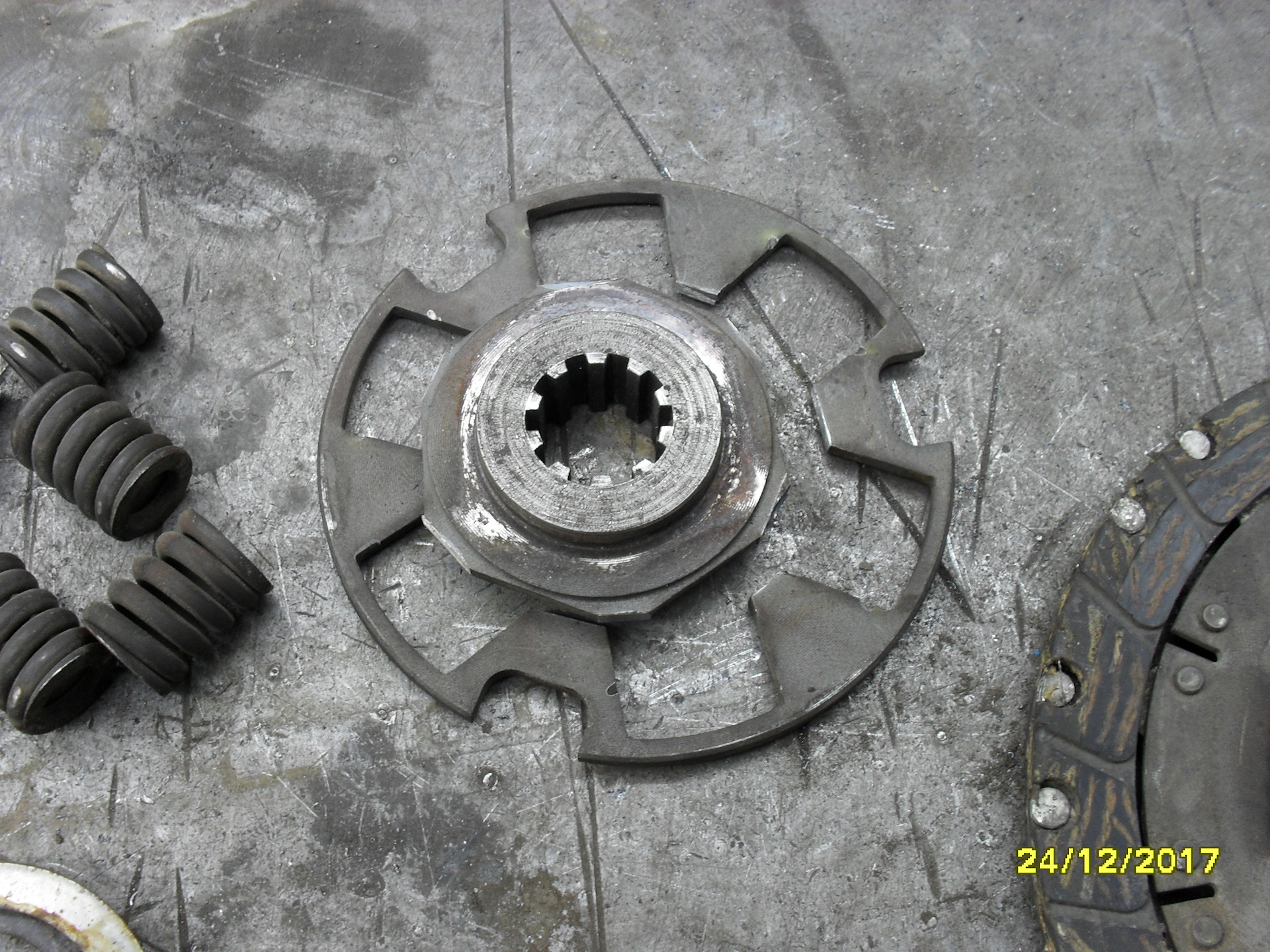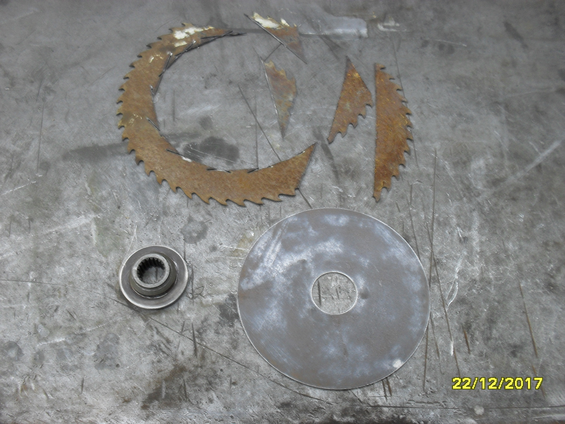 На родном Оковском моторе сцепление честно говоря не очень надежное. Да и первичный вал КПП какой-то игрушечный. В общем решил немного по мощнее сделать первичный вал и самодельный диск. Сначала хотел переделать из Оковского диска. Сделать так сказать родной диск с более мощными шлицами. Но при тщательном осмотре выяснил, что так сделать не получится. Решил делать самодельный диск. С пружинами ( демпфером) мудрить не стал. Скорость у трактора маленькая. Так, что должен и без пружин работать. При желании всегда можно если, что и с пружинами сделать. Для самого диска использовал циркулярную пилу времен СССР. Она тонкая и каленая ( ни то, что сейчас продают). В качестве накладок (феридо) использовал накладки от трактора ДТ-75. Не знаю где они стоят. Но в магазине продаются. Цена копеечная. Они правда немного толстоватые ( по сравнению с родными) Но ничего. На маховике и корзине была небольшая выработка и буртик по наружному диаметру. Это говорит о том, что новый диск сцепления от Оки может уже и не пойти. А тракторный в самый раз. Обточил эти буртики. По наружному диаметру тракторные накладки немного большеватые. На токарном станке обточил их. Отрезал от диска циркулярки лишнее. Потом зажал в патрон токарного станка и обточил по наружному диаметру. В качестве шлицевой втулки использовал внутреннюю часть от Жигулевского диска. И по просверленным отверстиям приклепал металлическими заклепками сердцевину. Накладки приклепал бронзовыми заклепками. На станке снова проверил биение. Немного обточил. Первичный вал тоже решил сделать из Жигулевского и Москвичовского. Отрезал от Москвичовского вала часть с подшипником . А от вазовского шлицевой конец. Скрестил их. Хотел уже было обваривать. Но потом пришла в голову мысль. А что если Москвичовский первичный вал использовать полностью? И варить ничего не нужно. В итоге на Москвичовском и остановился. Все заново. Выточил ступицу ( из Москвичовского диска сцепления). Наклепал ее на диск. Отрезал по размеру первичный вал. Теперь есть два варианта: С москвичовским первичным валиком и с Жигулевским. Для опоры первичного вала в коленвале Оковского двигателя пришлось выточить грибок. Запрессовал его в отверстие коленвала. И поставил в грибок шарикоподшипник. Теперь на очереди выжимной подшипник и вилка.
