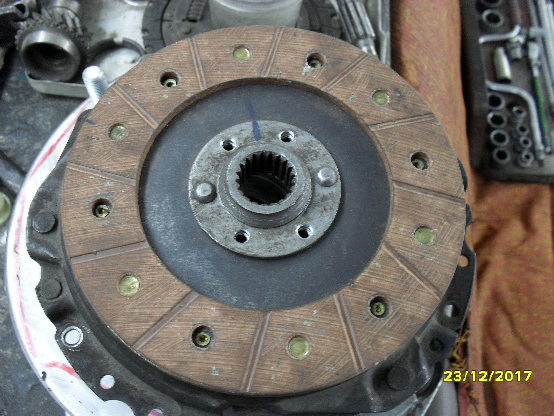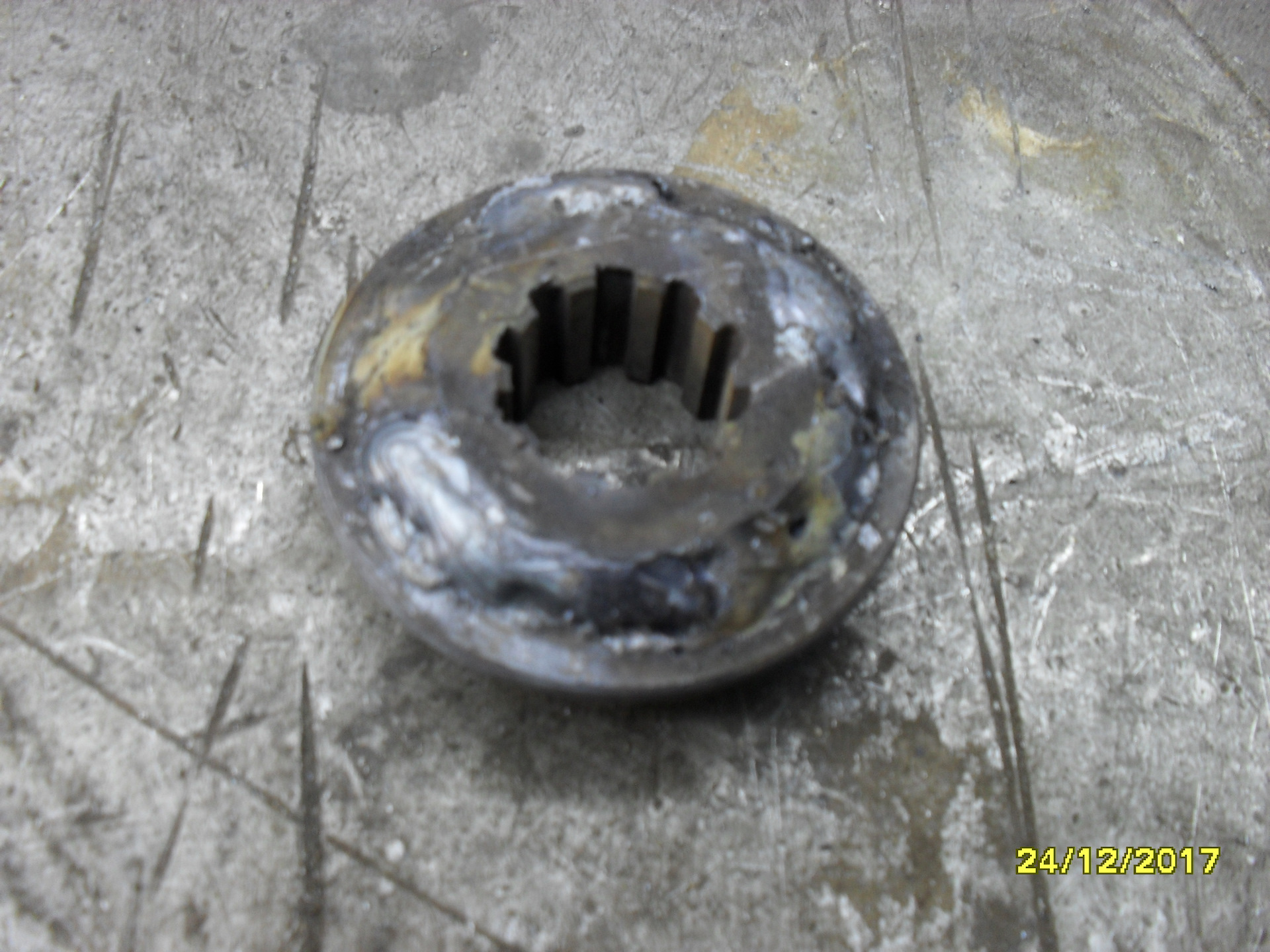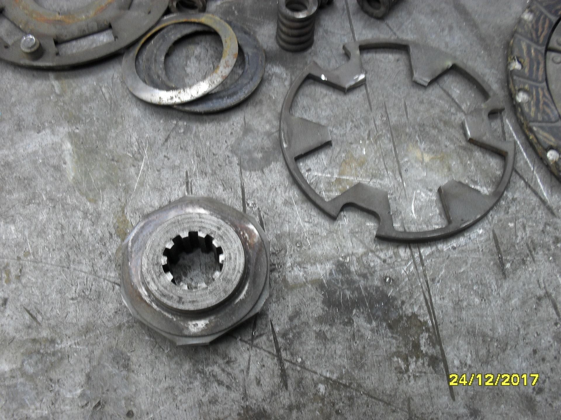На родном Оковском моторе сцепление честно говоря не очень надежное. Да и первичный вал КПП какой-то игрушечный. В общем решил немного по мощнее сделать первичный вал и самодельный диск. Сначала хотел переделать из Оковского диска. Сделать так сказать родной диск с более мощными шлицами. Но при тщательном осмотре выяснил, что так сделать не получится. Решил делать самодельный диск. С пружинами ( демпфером) мудрить не стал. Скорость у трактора маленькая. Так, что должен и без пружин работать. При желании всегда можно если, что и с пружинами сделать. Для самого диска использовал циркулярную пилу времен СССР. Она тонкая и каленая ( ни то, что сейчас продают). В качестве накладок (феридо) использовал накладки от трактора ДТ-75. Не знаю где они стоят. Но в магазине продаются. Цена копеечная. Они правда немного толстоватые ( по сравнению с родными) Но ничего. На маховике и корзине была небольшая выработка и буртик по наружному диаметру. Это говорит о том, что новый диск сцепления от Оки может уже и не пойти. А тракторный в самый раз. Обточил эти буртики. По наружному диаметру тракторные накладки немного большеватые. На токарном станке обточил их. Отрезал от диска циркулярки лишнее. Потом зажал в патрон токарного станка и обточил по наружному диаметру. В качестве шлицевой втулки использовал внутреннюю часть от Жигулевского диска. И по просверленным отверстиям приклепал металлическими заклепками сердцевину. Накладки приклепал бронзовыми заклепками. На станке снова проверил биение. Немного обточил. Первичный вал тоже решил сделать из Жигулевского и Москвичовского. Отрезал от Москвичовского вала часть с подшипником . А от вазовского шлицевой конец. Скрестил их. Хотел уже было обваривать. Но потом пришла в голову мысль. А что если Москвичовский первичный вал использовать полностью? И варить ничего не нужно. В итоге на Москвичовском и остановился. Все заново. Выточил ступицу ( из Москвичовского диска сцепления). Наклепал ее на диск. Отрезал по размеру первичный вал. Теперь есть два варианта: С москвичовским первичным валиком и с Жигулевским. Для опоры первичного вала в коленвале Оковского двигателя пришлось выточить грибок. Запрессовал его в отверстие коленвала. И поставил в грибок шарикоподшипник. Теперь на очереди выжимной подшипник и вилка.