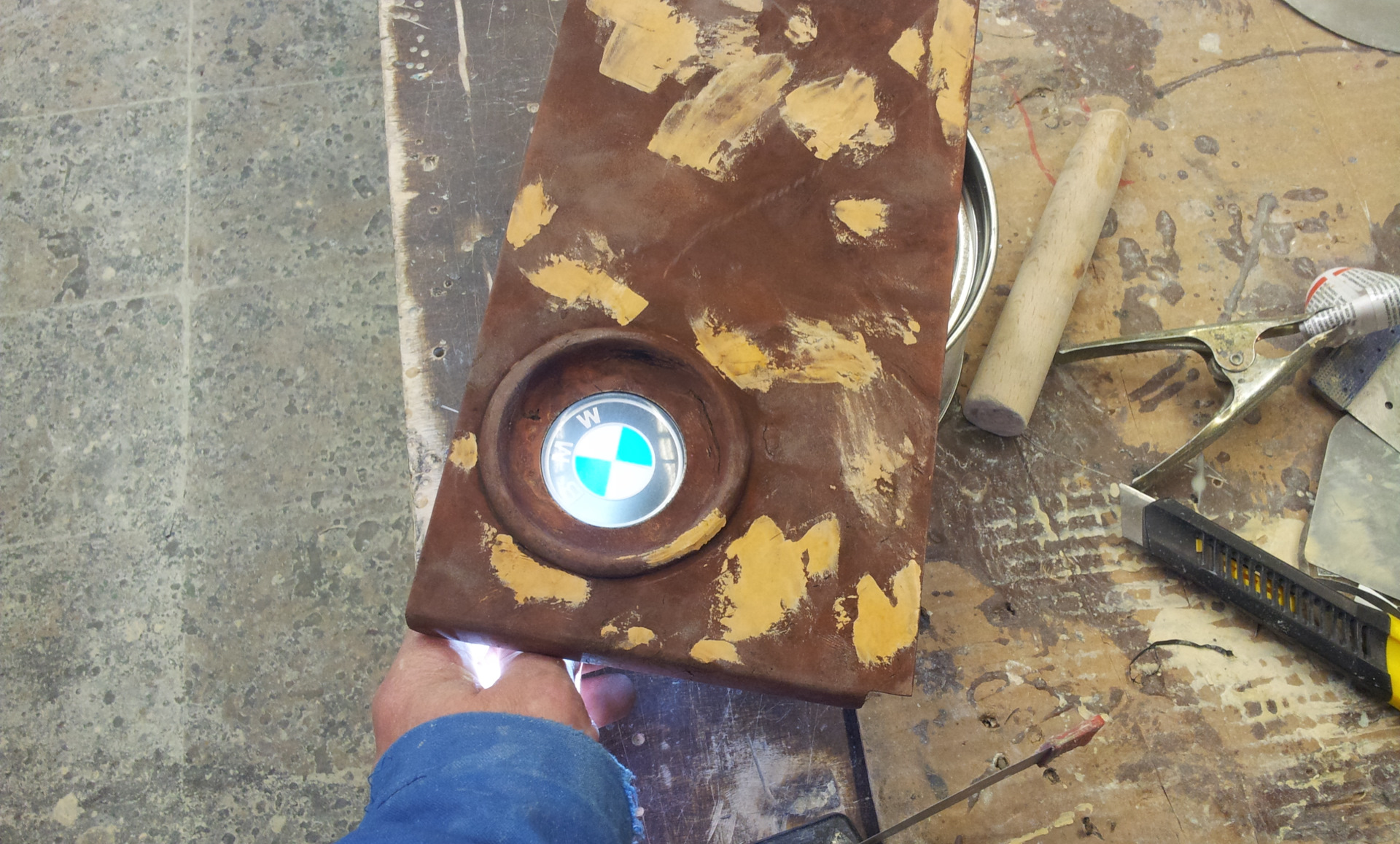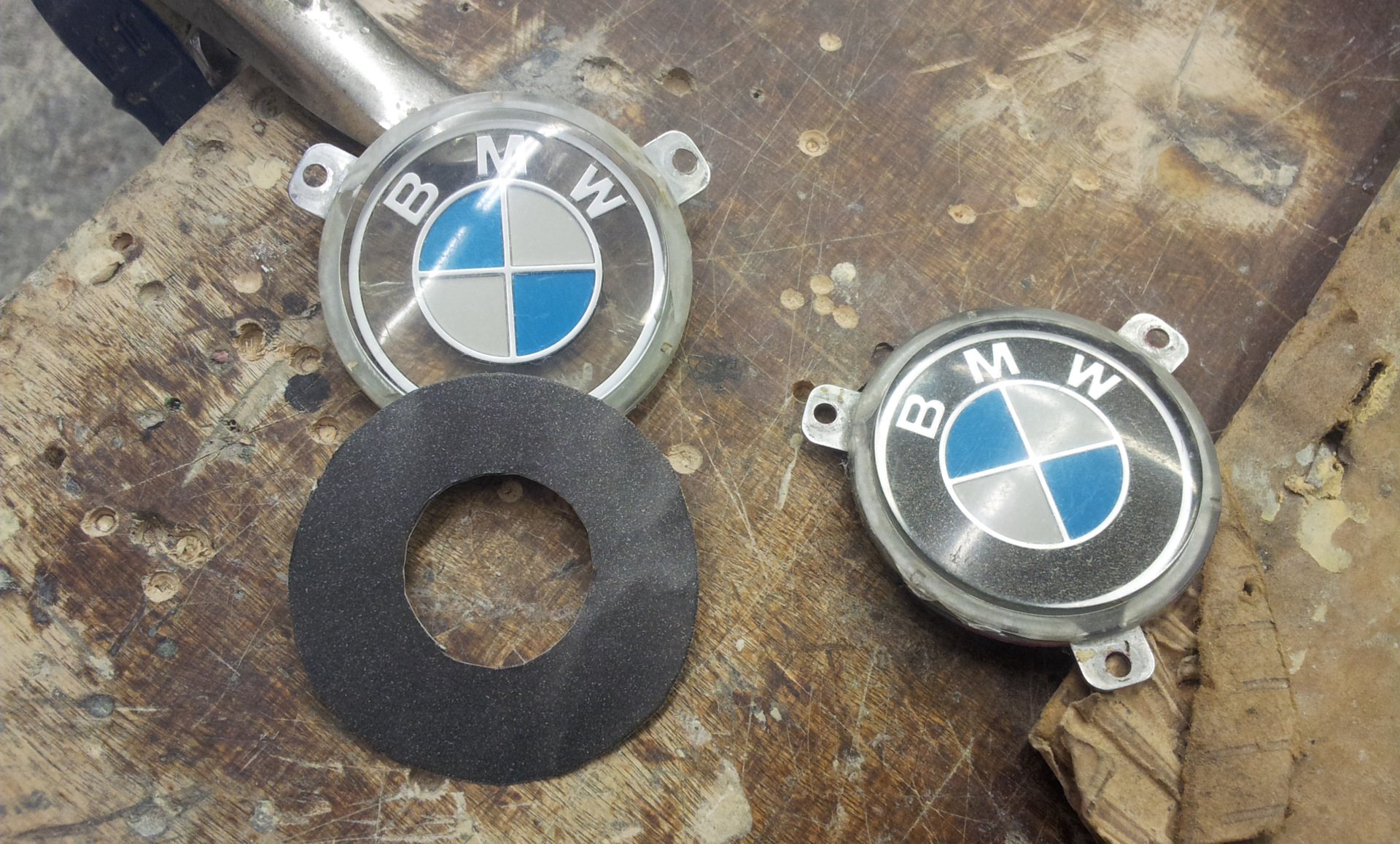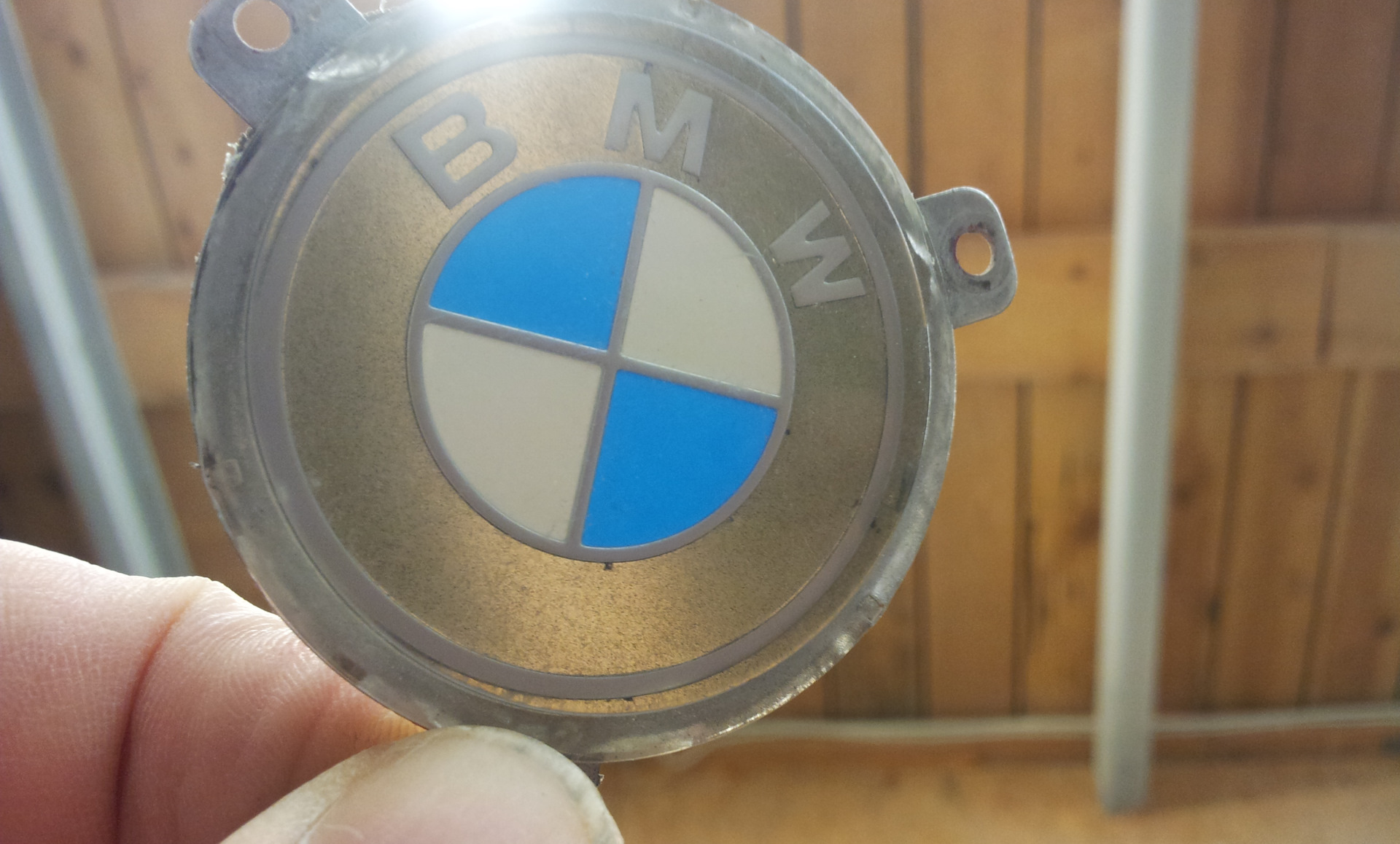 Были у меня старые рули. В них подушки безопасности. В подушках значки БМВ. Только на рестайлах эти значки уже плоские и безликие, а на первых машинах они объёмны и выполнены из склеенного акрила. Выковыриваю 2 штуки из подушек. Переворачиваю и под водой, мелкой наждачкой, снимаю всю цветную краску до прозрачности. Остаётся лишь вдавленный контур и буквы. Они залиты серебрянкой и на лицевой стороне выглядят выпукло и эффектно.