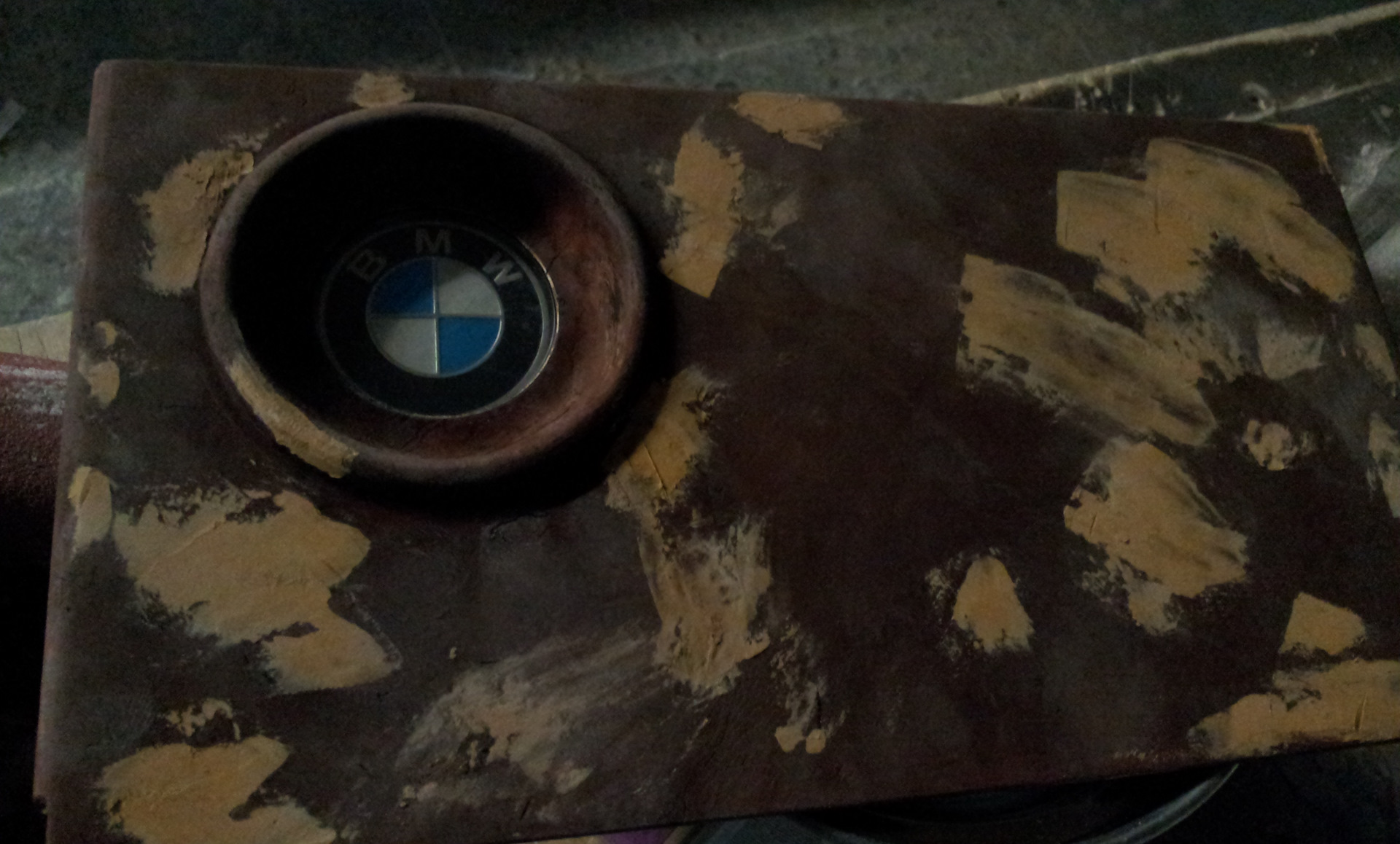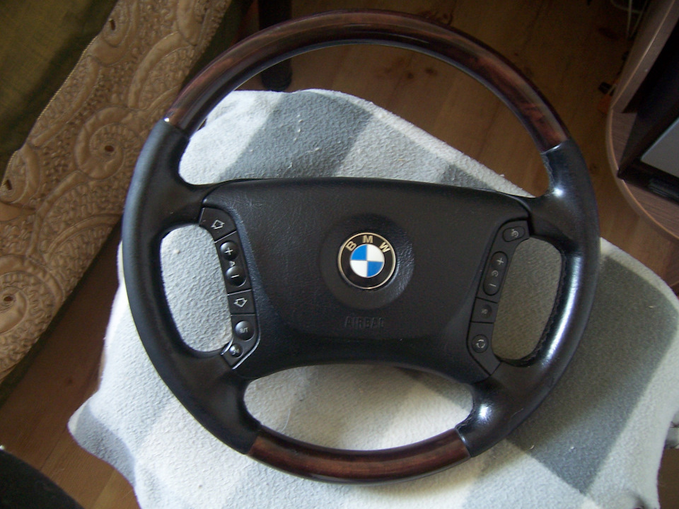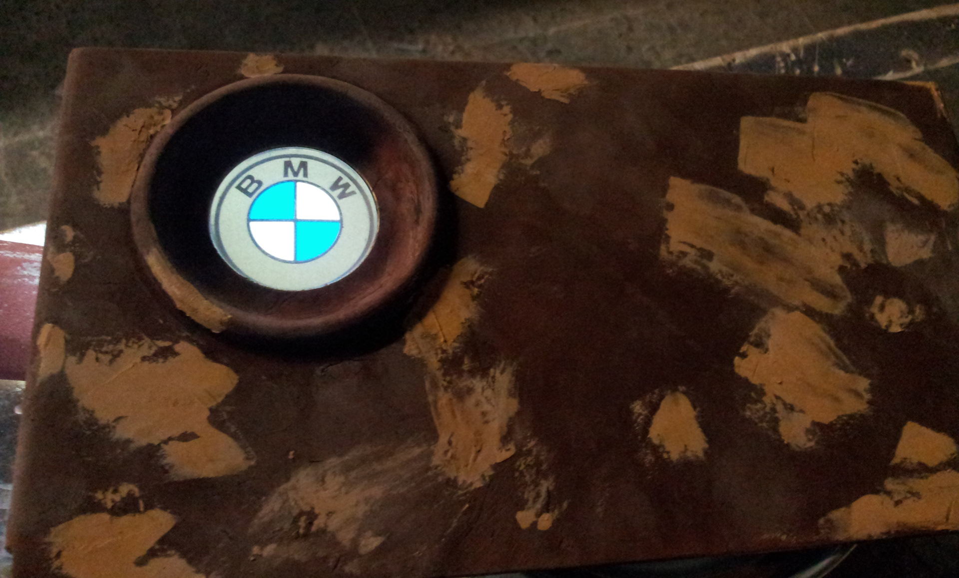 Были у меня старые рули. В них подушки безопасности. В подушках значки БМВ. Только на рестайлах эти значки уже плоские и безликие, а на первых машинах они объёмны и выполнены из склеенного акрила. Выковыриваю 2 штуки из подушек. Переворачиваю и под водой, мелкой наждачкой, снимаю всю цветную краску до прозрачности. Остаётся лишь вдавленный контур и буквы. Они залиты серебрянкой и на лицевой стороне выглядят выпукло и эффектно.