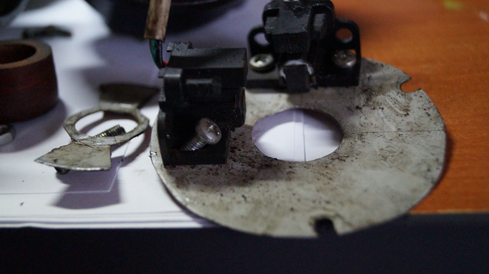 Открыв крышку трамблёра, я увидел страшную картину… Площадка на которой стоят датчики поведена, а шторка от удара в датчик холла, скручена в "бараний рог". Вообщем механическая часть подводного зажигания полностью выведена из строя. Почему так получилось ? Да потому, что эти "железки" были сделаны из кофейных банок, А УАЗ не терпит в себе "жидких" деталей )))