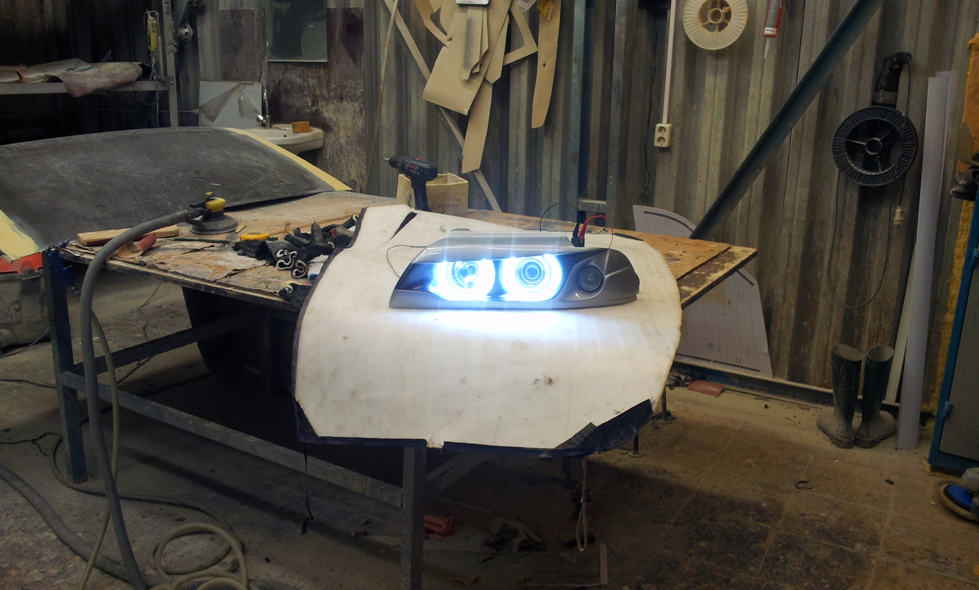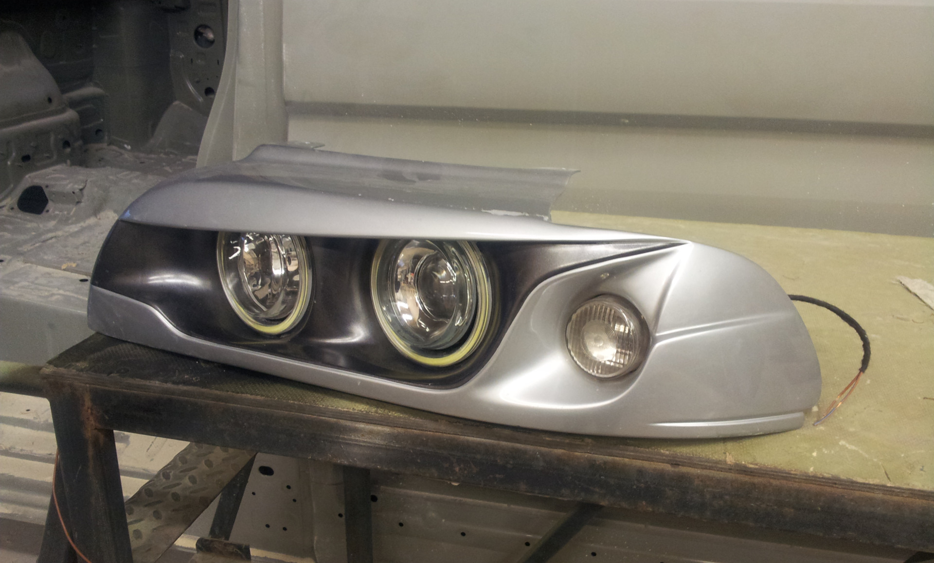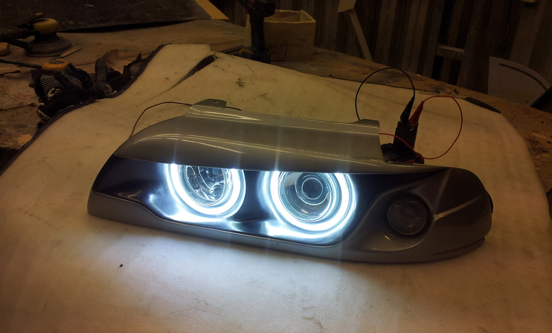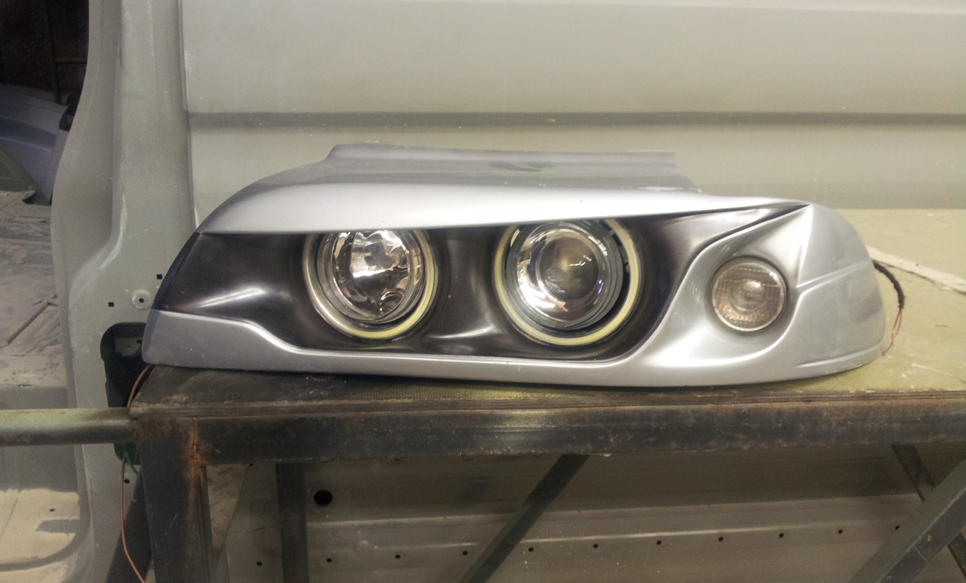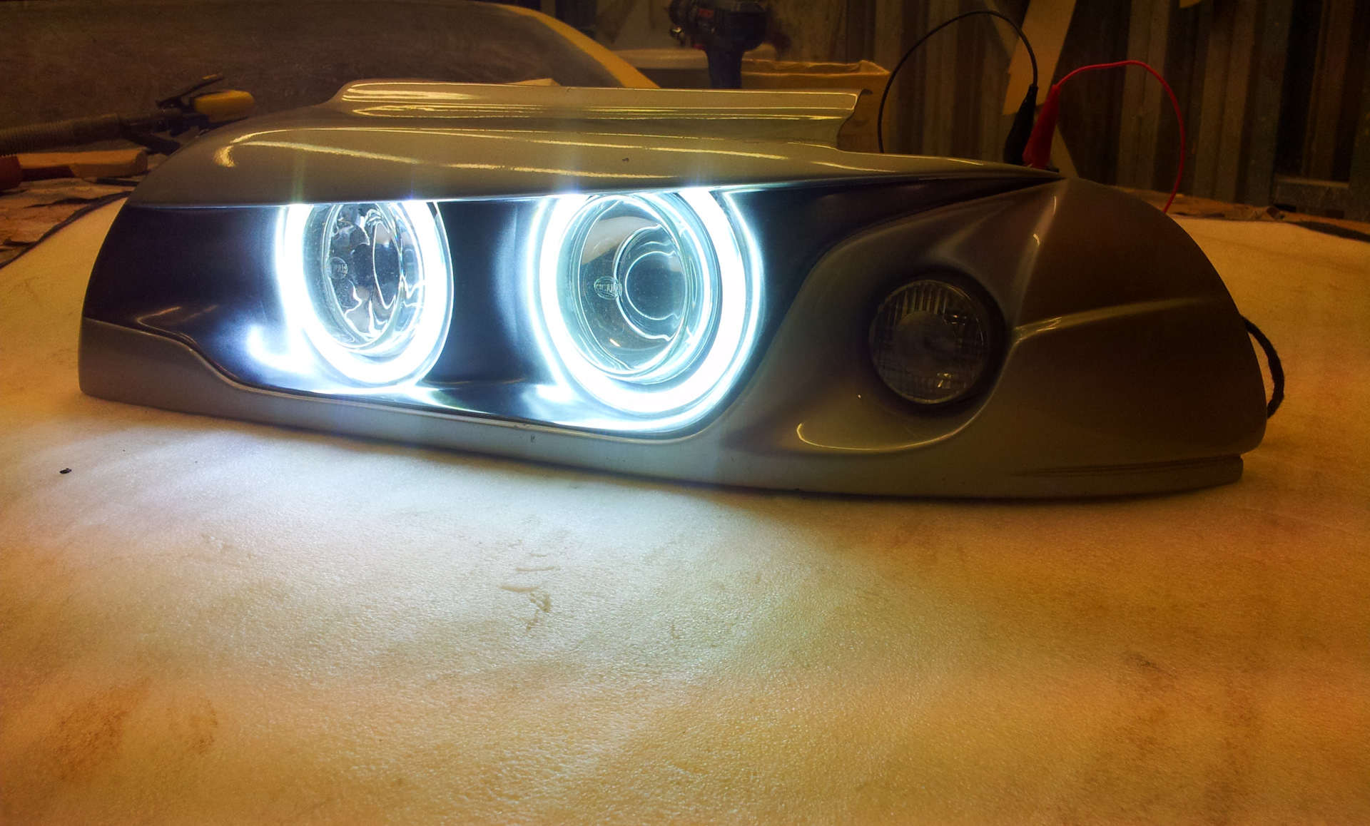 Это фары головного света для кузова Е39( до и после рест). 2 шт, со всеми креплениями. Фары представляют из себя тюнинг сборку оригинальных хелловских модулей 90мм с покровным запатентованным стеклом и подиума из стеклопластика самостоятельного изготовления.
