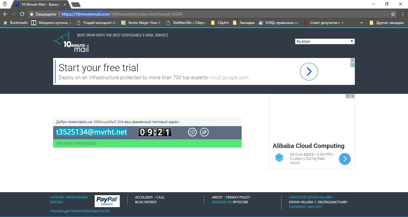 1 Создаём временный почтовый ящик, чтобы навсегда потом о нём забыть. Я использую 10minutemail.com
