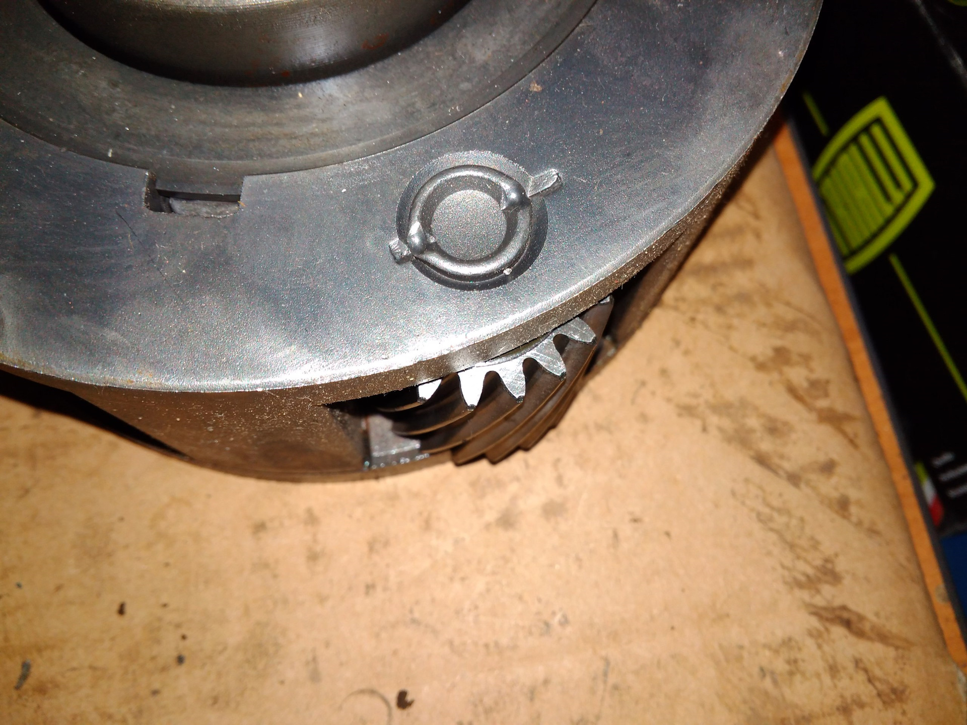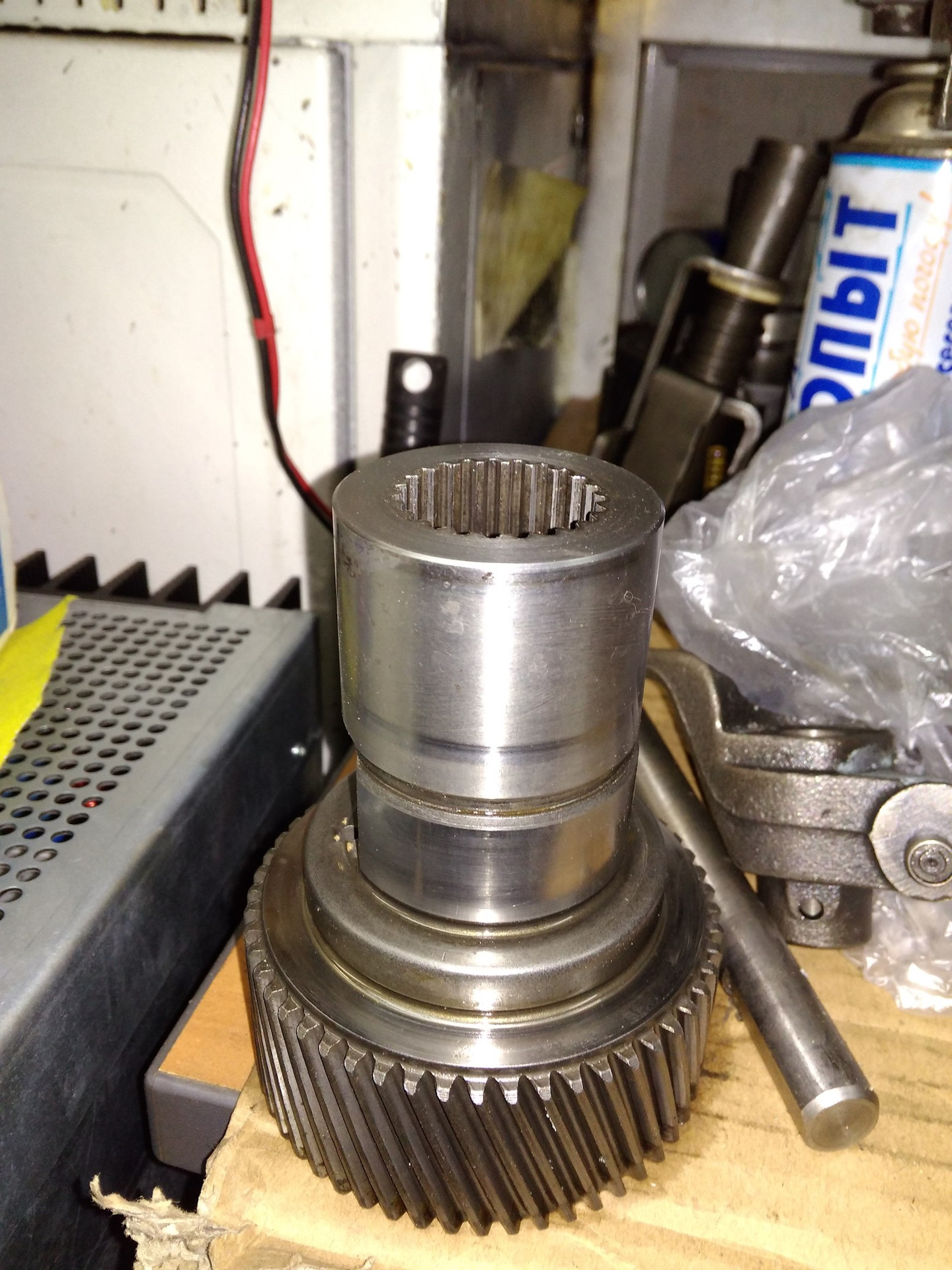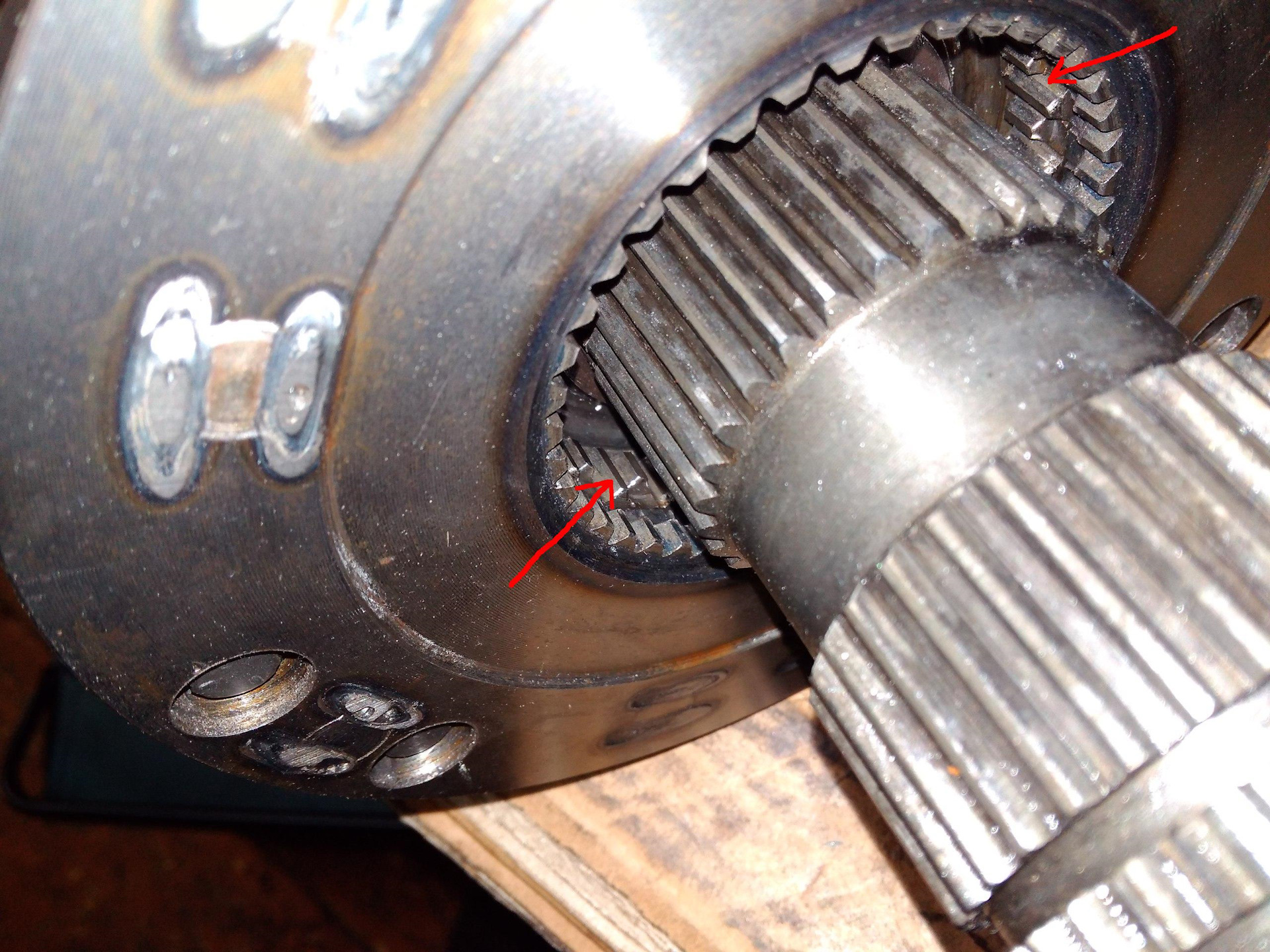 Далее собираем диф один из двух. На дифе от 242 шлицевая часть которая должна зацепляться с вискомуфтой маленькая и они просто не дотягиваются до нее. У 242 видно, что эта часть большеПоэтому переставляем эту шестеренку из дифа 249 в диф 242. В дифе 242 есть зубцы парт тайма. В дифе 249 их нет!еще и поэтому нужно переставлять шестерниВерхнюю часть дифа я взял тоже от 249 из за бронзовой втулки в центре. С ней может лучше будет скольжение шестерни)))Диф всборе. Звезда цепи от 242 на 6 мм тоньше чем от 249(цепь шириной у 242 1 дюйм, а у 249 1,25 дюйма)поэтому звезда от 242 на шестерне от 249 не зафиксируется стопорным кольцомДелаем проставку до стопорного кольцаСамой сложным было собрать иглы подшипника в шестерне и вставить туда вал. Намазал стенки моторным маслом иглы прилипли и не выпадывали. После этого вставил вал на место. Еще чтоб убрать люфт в дифе и part time и full time четко включались и не вылетали выточили шайбу, закалили её до 60 единиц(чтоб не смозолило ее там) и вставил между двух шестерней. Сфоткать ее забыл. Стрелкой пометил где она стоитВал с дифом всбореВходной вал у 242 был на 21 шлиц, а у меня коробка АХ 15 на 23 шлица. Благо у меня было несколько планетарок и я взял нужный мне вал на 23 шлица и с тупыми зубцами на шестерне. Зубцы на шестернях планетарок бывают ДВУХ видов!Тупые зубцыОстрыеТак как вал у 249 был длиннее чем надо его укоротили