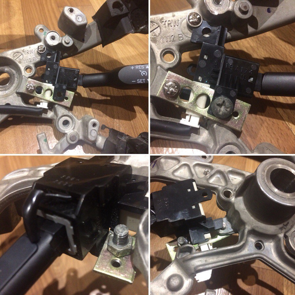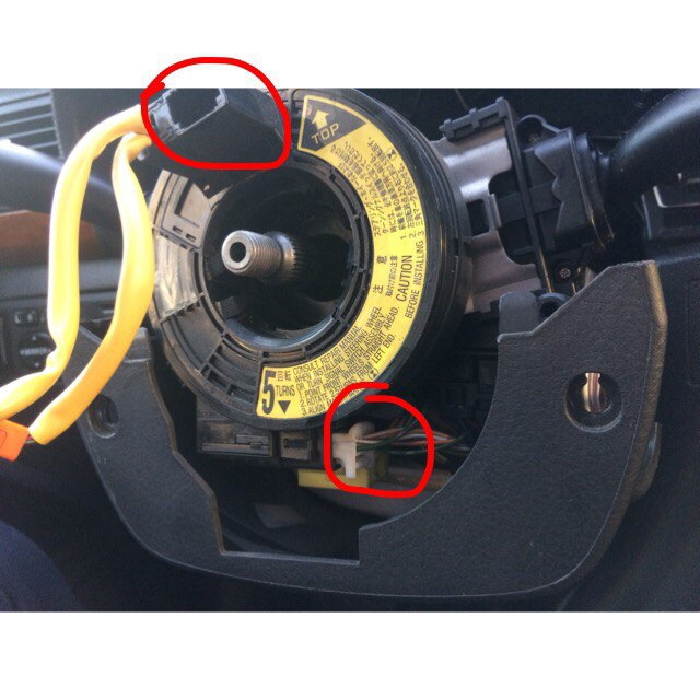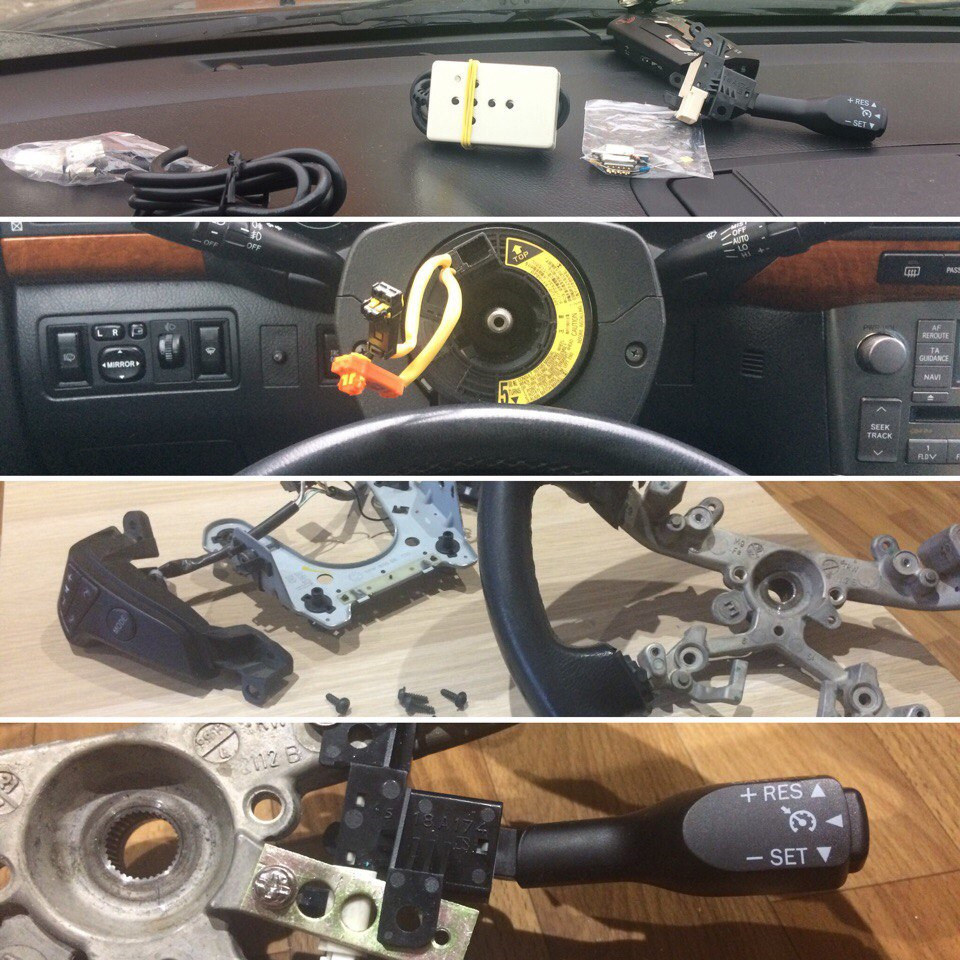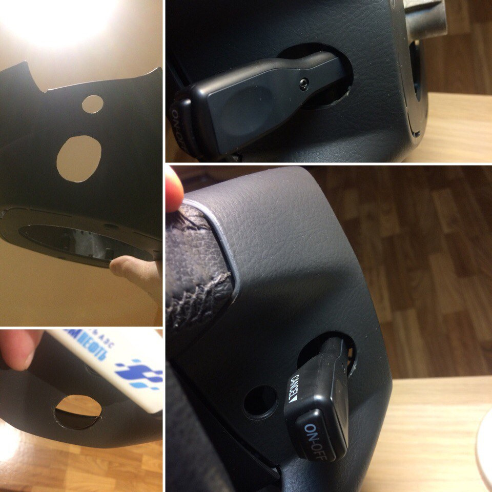 День 1: получил в пзДЕК’е посылку от Ивана из Зеленограда (www.toyota-cruise.ru/order/#order1) и начал обдумывать инсталляцию не без помощи Ивана и Артема (govzich). В первый же день снял руль. Там все очень просто. Нужен торкс на 30 и головка на 19. Клемму аккума не снимал, т.к чтоб бахнула airbag нужно очень постараться, главное все делать аккуратно и не спеша. Снял. Принес домой и начал окончательную разборку руля, ориентируясь на записи Артема из Минска (www.drive2.ru/l/487962161969103011/). Рычажок (он же джойстик, он же joystick, он же палочка удовольствия) установил примерно на штатное место, но не без колхоза, на фото представлен вид, да, на вид то еще зрелище, но установлен капитально, без люфта и соплей. Что для меня оказалось сложным, так это вырезать отверстие под рычажок, делал отверстие используя мега-инструмент — глазомер, попал в точку. Но я его не вырезал, вернее сделал ножом небольшое отверстие, а потом при помощи зажигалки и большого и указательного пальца начал расширять отверстие, придавая ровную форму овала. Получилось без бахромы и ровно в окончательном варианте, попал точно в проекцию рычажка. Он ни за что не цепляется и имеет свободный ход (на себя, вверх, вниз). Далее в штатную «мамку» добавил 2 разъема, ранее купленных в радиодеталях. Все получилось и можно ставить обратно в автомобиль. На этом я завершил первый день, положив начало. Решил делать рычажок первым, т.к в отзыве Артема упоминалось, что это самое муторное…но нет…дальше веселее. Скажу наперед, установку КК завершал головой в луже талого снега на коврике, стоя на коленях и вспоминая всех кого я знал и не любил))