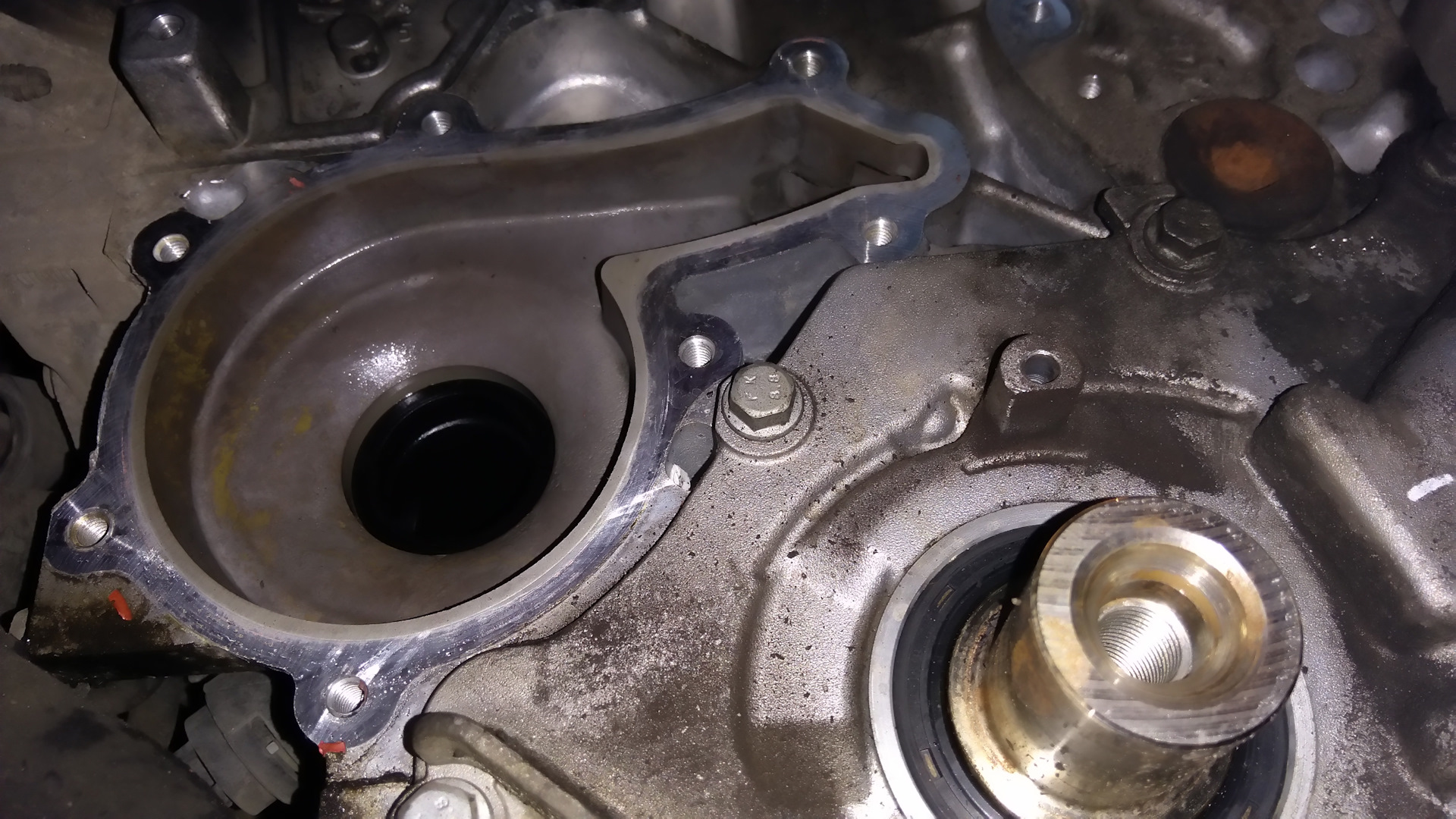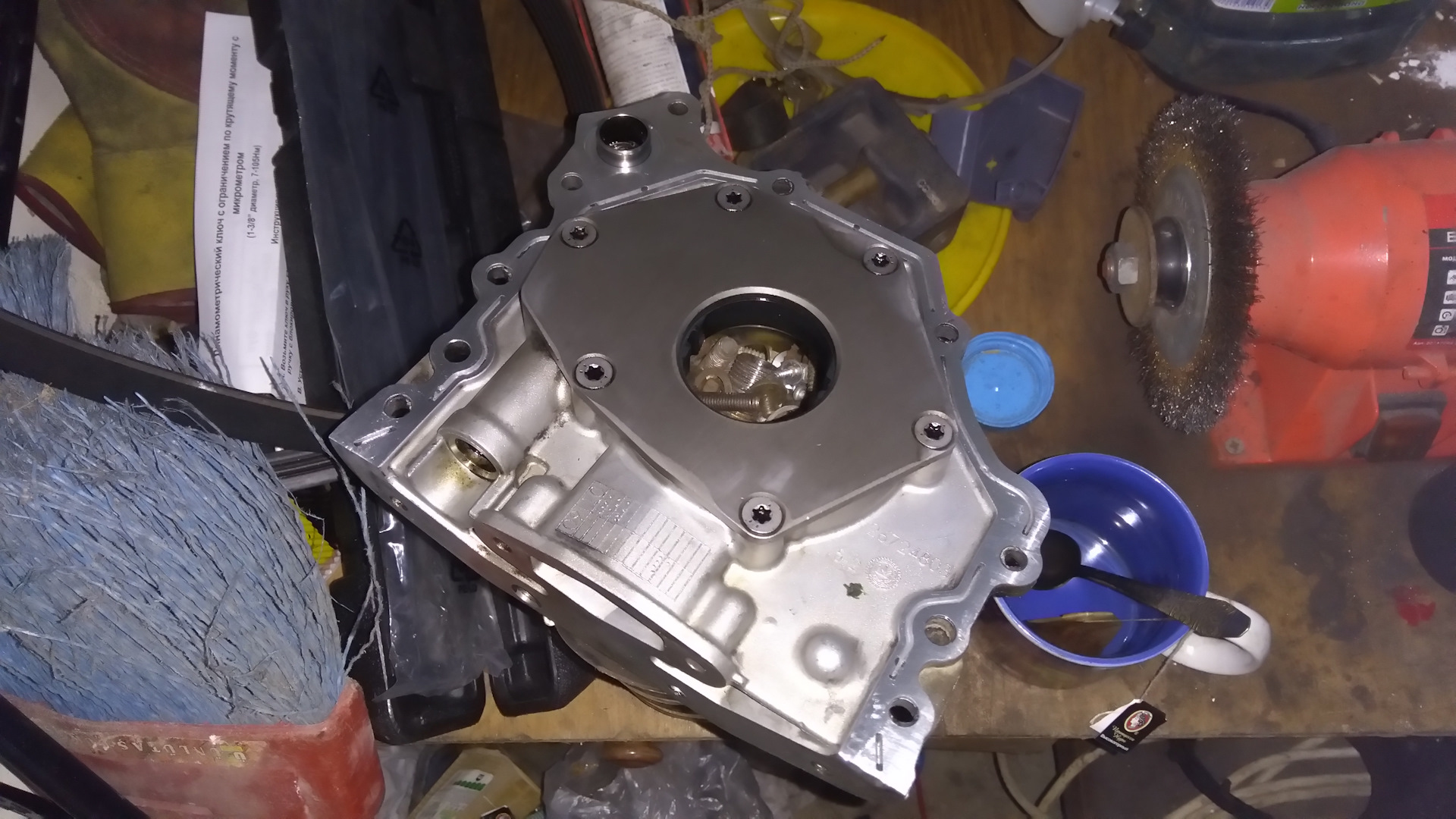 Насос отдираем от остатков герметика, вытаскиваем сальник коленвала, меняем уплотнительное кольцо