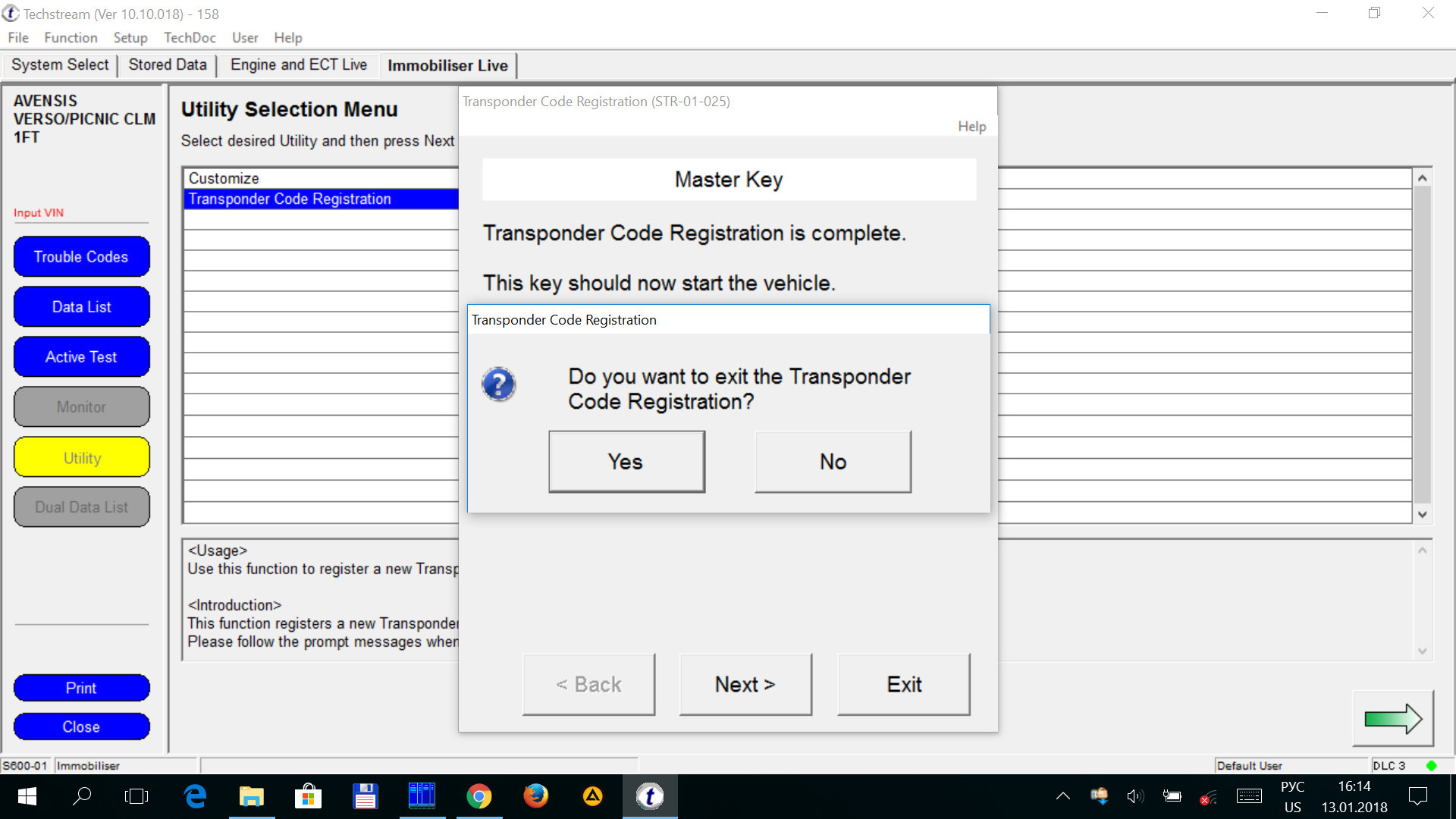 Вытащите мастер ключ из зажигания в течении 10 секунд и нажмите Next