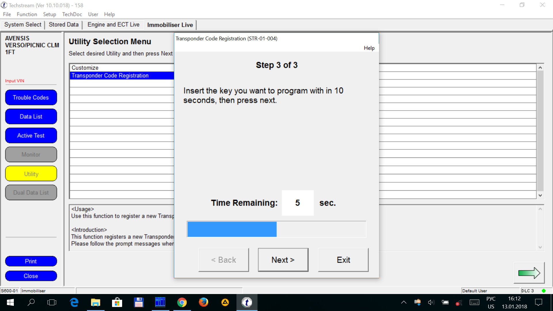 Вставьте зарегистрированный (рабочий) мастер ключ в замок зажигания и включите зажигание за 120 секунд и нажмите Next.