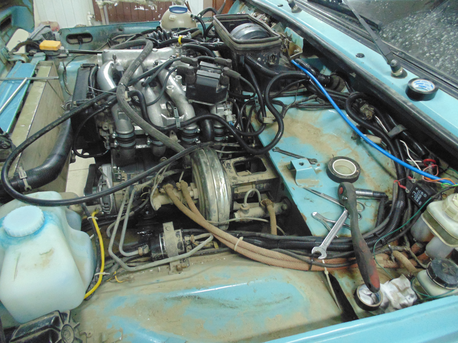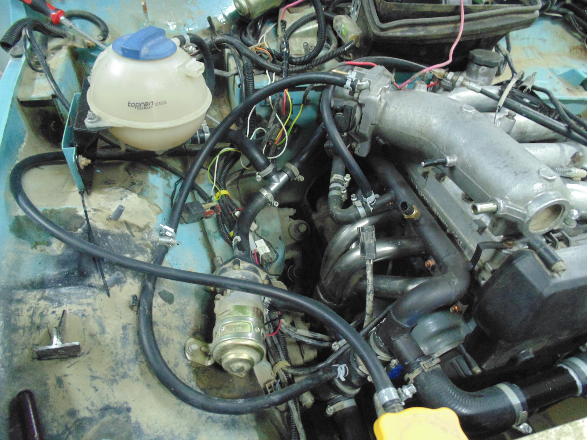 Монтаж системы охлаждения, расширительный бачок в очередной раз переезжает. Подключен через тройник к обратке печки. Патрубок от Клубтурбо коротковат оказался и верхний патрубок радиатора пришлось соединить куском обводной трубы Приоры. Так даже лучше получилось-нет длинного шланга, всё компактно.