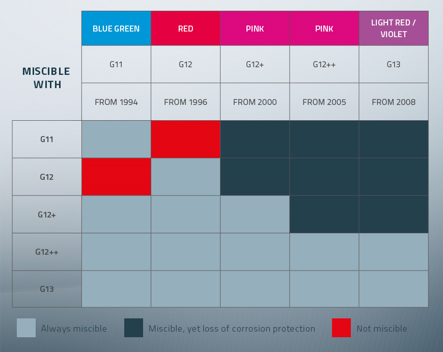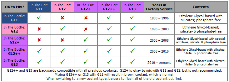 Единственная адекватная картинка, на мой взгляд, – последняя. Смешивать можно все, но нужно учитывать, что карбоксилаты в G12 и его потомках становятся практически бессмысленными в системе охлаждения, где ранее был силикатный антифриз и все покрыто толстым защитным слоем. Но в плане безопасного смешивания проблем быть не должно. Единственное – при добавлении G12++ и G13 в G11 цвет меняется на коричневый ;)