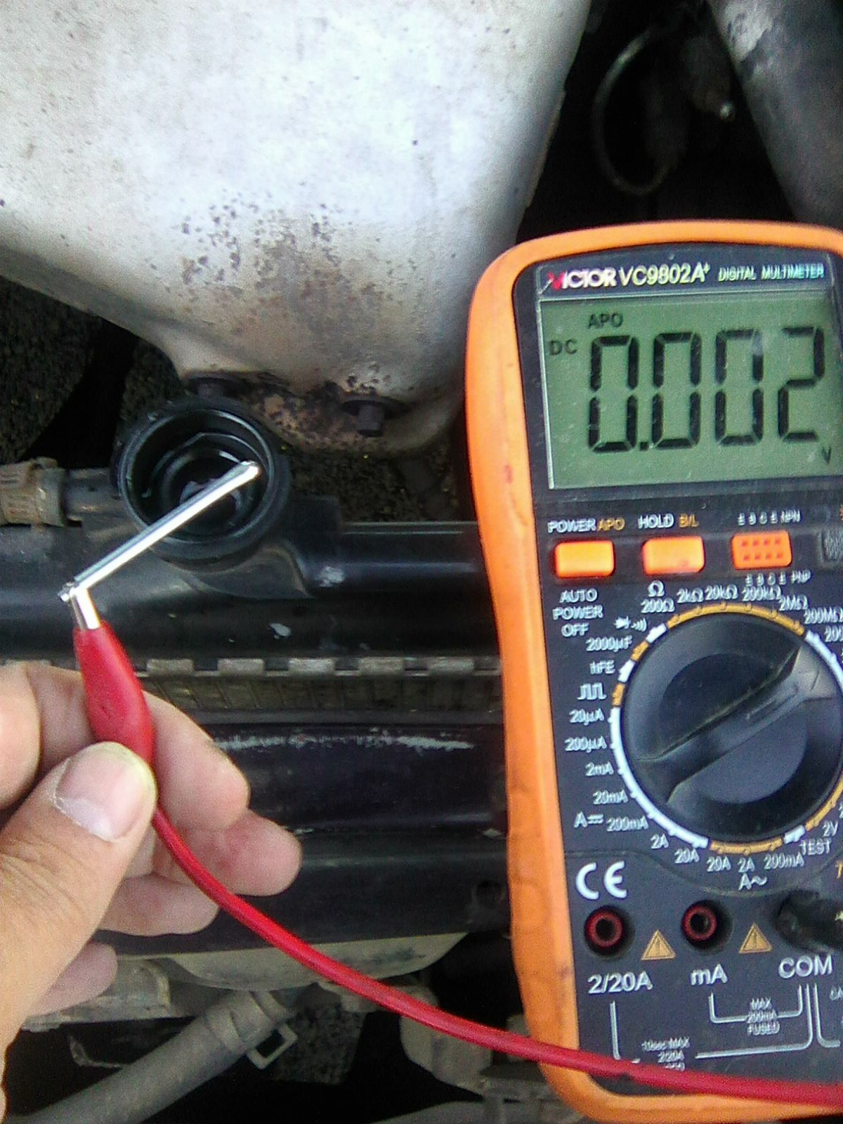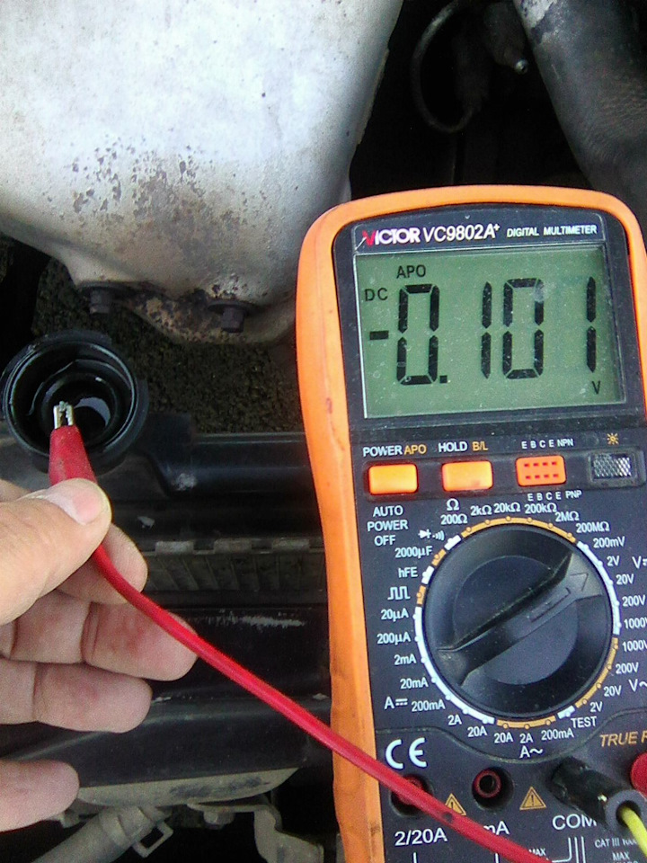 На электропроводность. Со временем в антифризе накапливаются ионы водорода, что, кроме как по смещению pН в кислую сторону <7, можно определить по появлению тока через ОЖ. Берем мультиметр, ставим режим вольтметра, минусовой щуп к (-) клемме аккумулятора или любой точке мотора, плюсовой щуп опускаем в антифриз. Замер нужно производить при работающем двигателе. Норма – напряжение не более 0,1В. Этот показатель косвенно говорит о том, что в системе охлаждения либо есть (напряжение более 0,3-0,4В) либо почти нет условий для электрохимической коррозии металлов. В моем случае вольтметр показывает 29 мВ, что в 3 раза меньше допустимого.