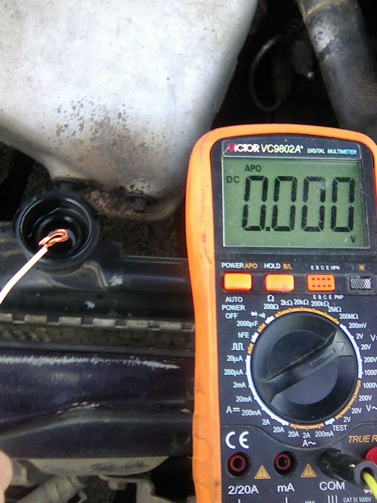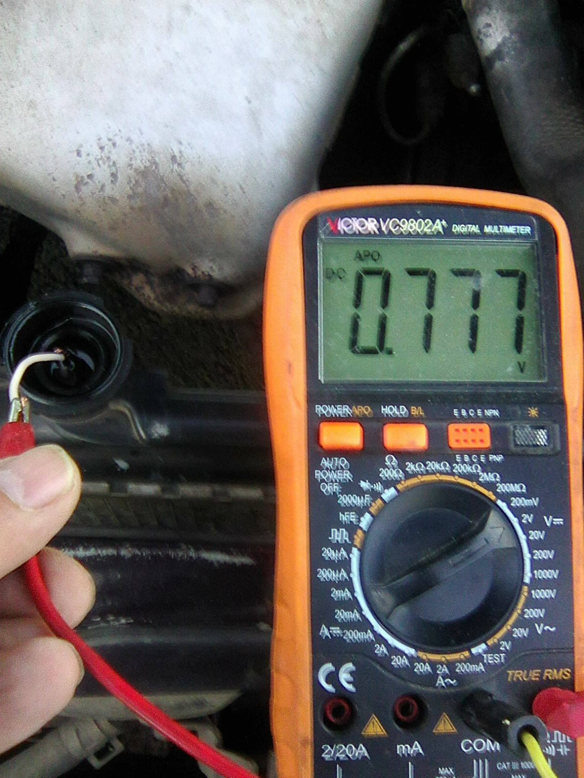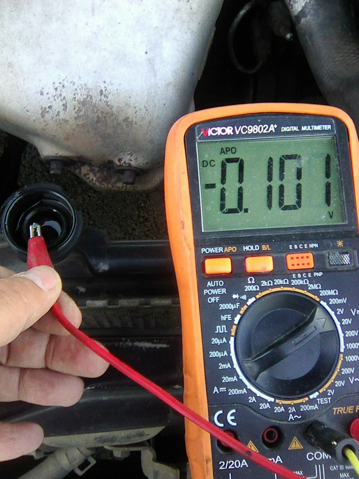 Большая разница. Если двигатель заведен, то на кузове, да и вообще куда кинут минус и откуда взят минус для запитывания устройств полно блуждающих токов (протекающих от минуса к фарам или габаритам, или что там у нас еще массу с кузова берет). Слабую разницу потенциалов, которая может возникнуть от гальванопары щупов эти токи просто затопчут. А заводить двигатель перед замерами предлагал ТС.