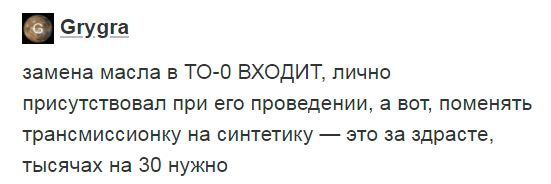замена масла в ТО-0 ВХОДИТ, лично присутствовал при его проведении, а вот, поменять трансмиссионку на синтетику — это за здрасте, тысячах на 30 нужно