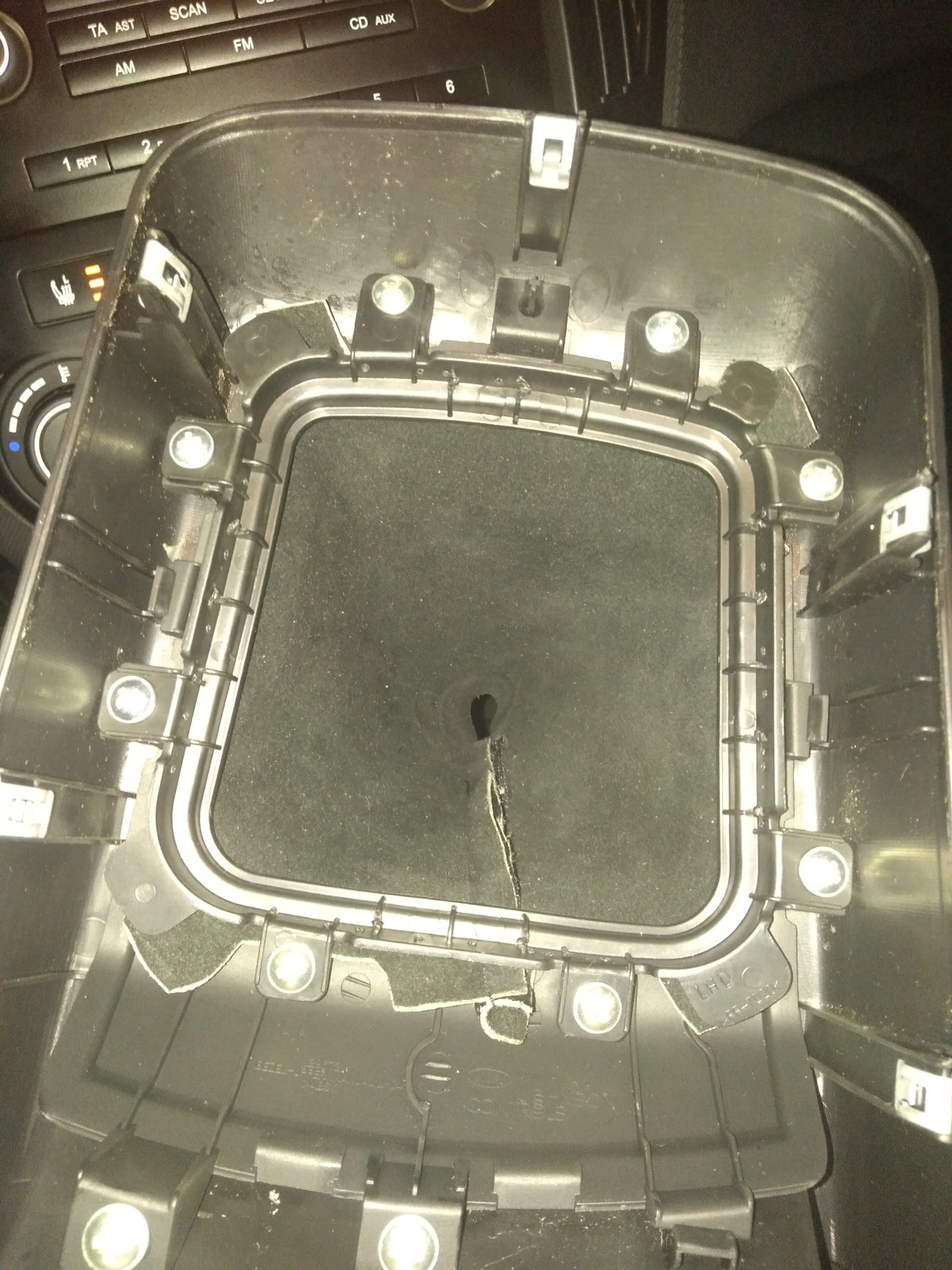 2. Сдергиваем панель с кожухом, пытался подцепить отверткой и спец лопатками пластиковыми, но не поддалась. Хорошенько прогрелся салон и просто дёрнул панель вверх руками, вышла достаточно легко;