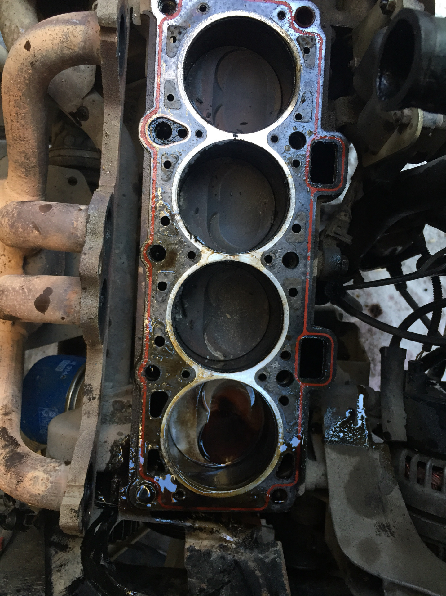 Это чего же там такого приключилось, что и блок и ГБЦ шлифовать пришлось? и чем залит 1 цилиндр? маслом, антифризом, бензином, водой может? :) просто на фото он залит маслом, а поршень очищен явно парами антифриза.