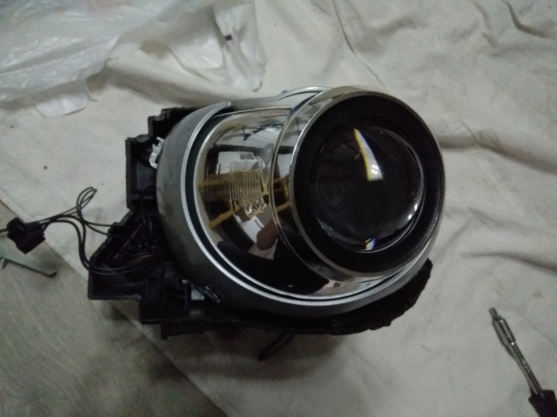 Галогеновую фару так порезать не получилось. Внутри фары направляющая для регулировки наклона линзы и толстый слой пластика. Пришлось резать по всему периметру фары, дабы не повредить это механизм. Благо я купил дешево фару без креплений и экспериментирую на ней =))
