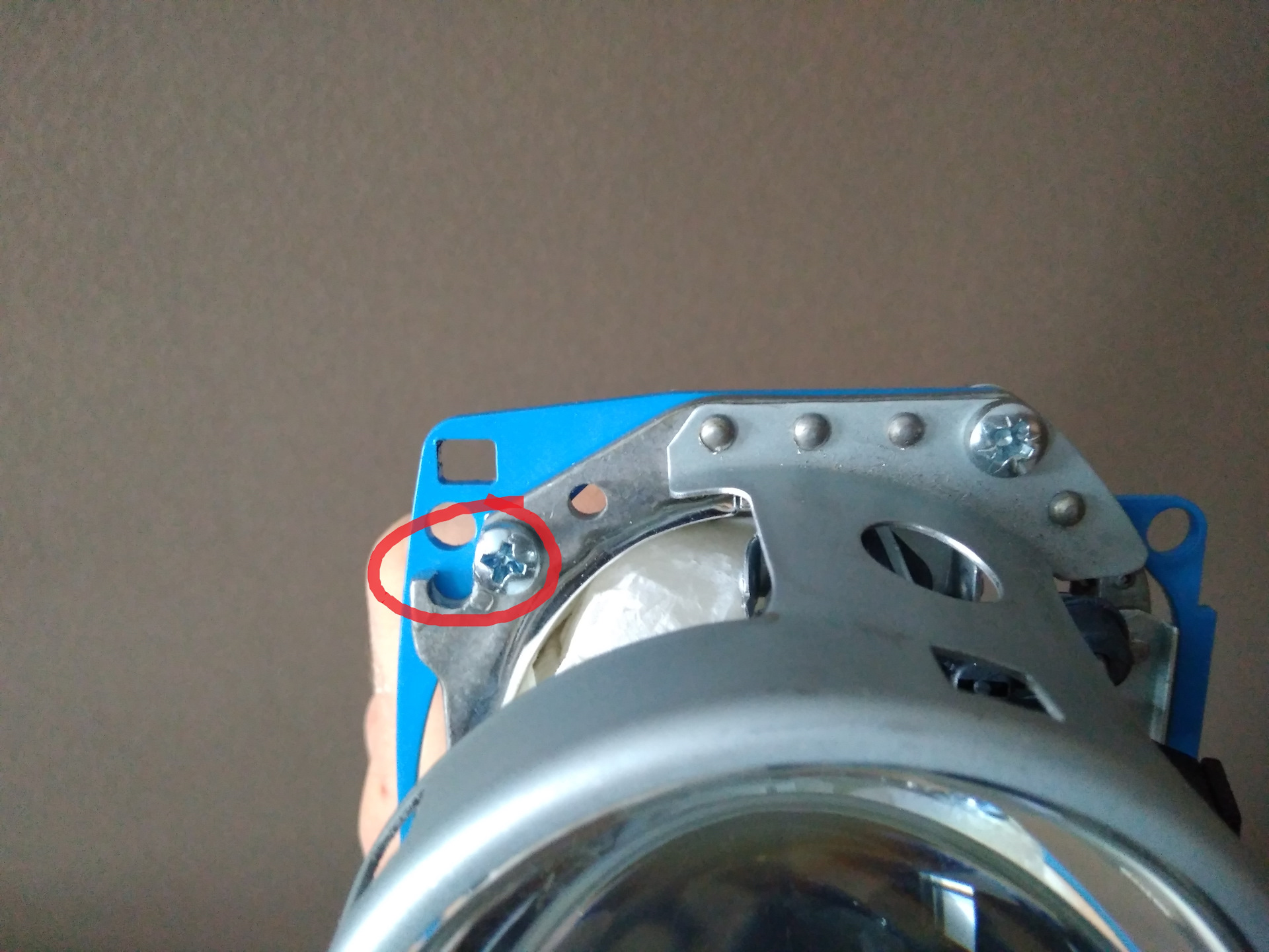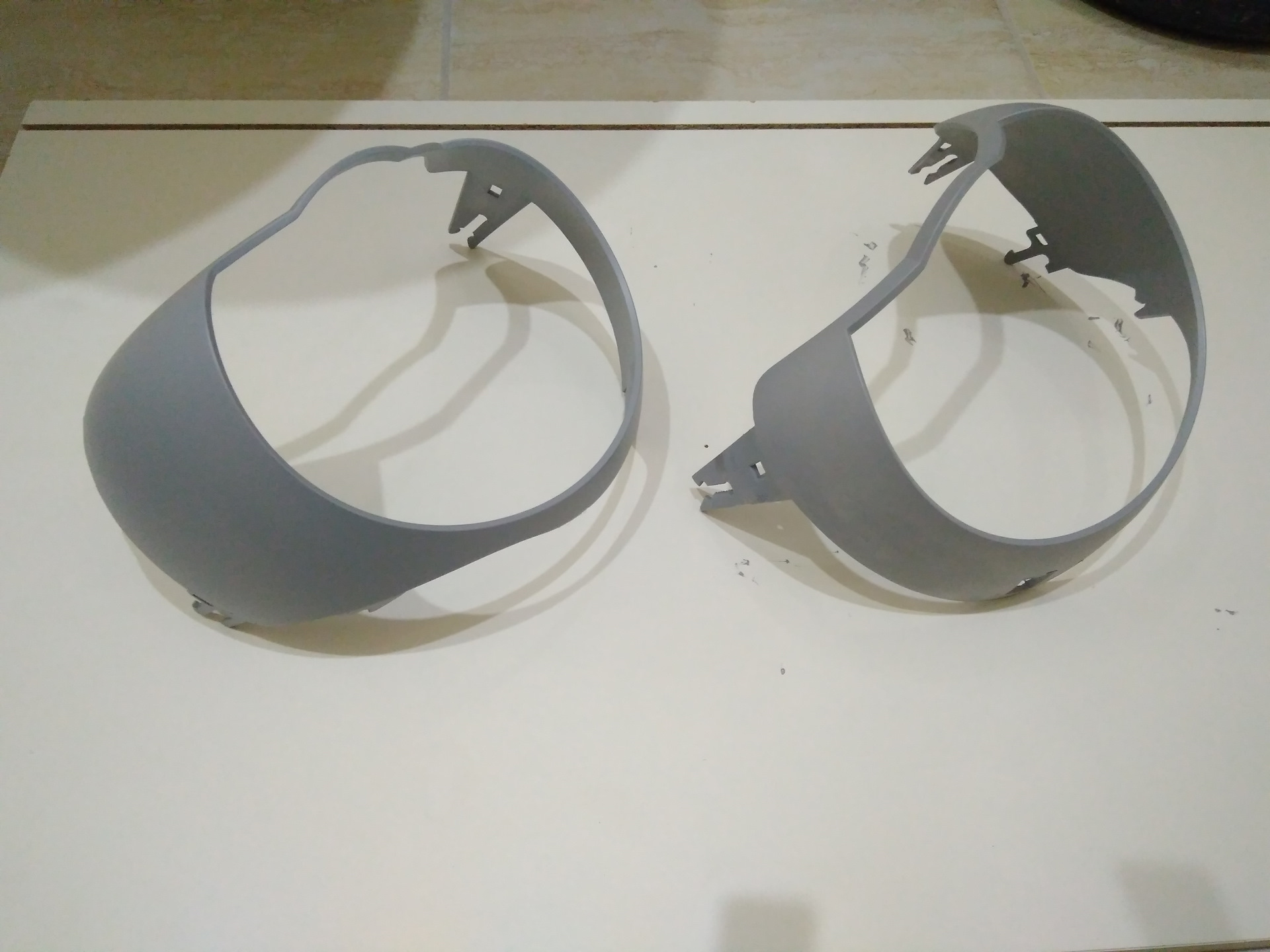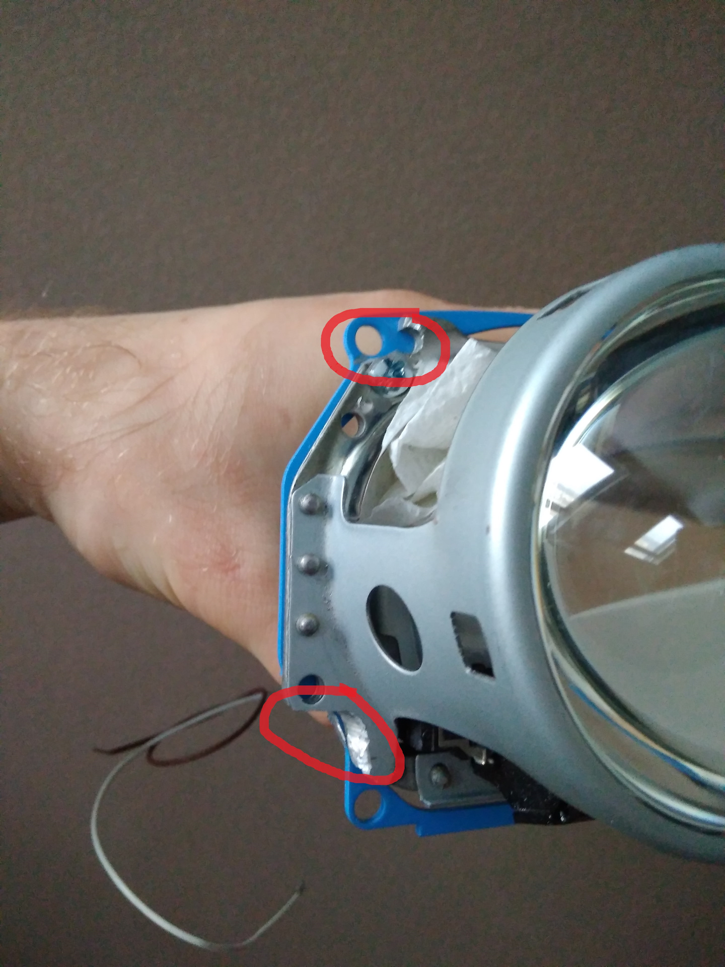Далее подгоняем посадочные места под новую линзу. Здесь отпиливаем часть "ушек" тут будут находиться гайки, крепящие линзу к рамке.