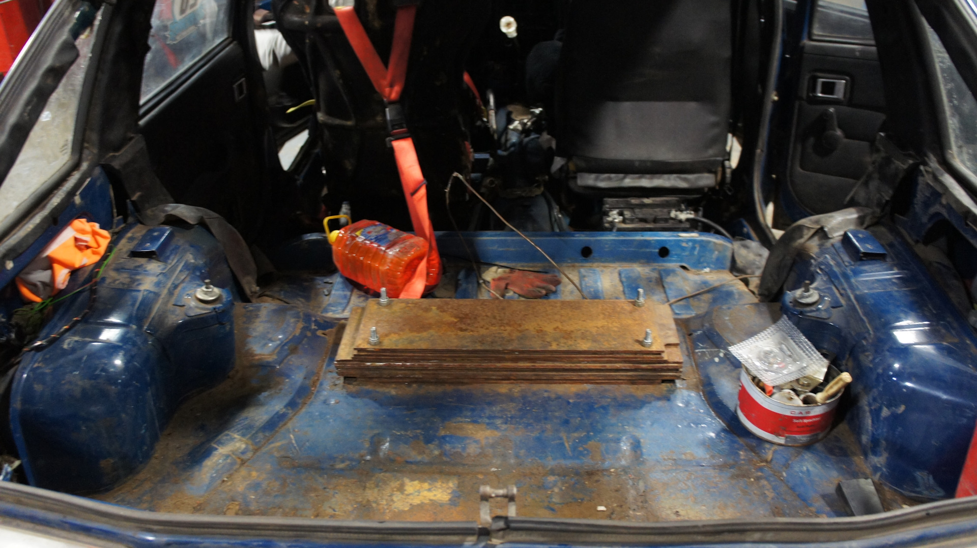 В один из вечеров совместно с Yurich16 мы распилили завалявшийся лист 4-х или 5-ти мм железяки, насверлили в кусках отверстия под 10-ый болт…и разместили балласт над задней осью. Мы посчитали это место самым удачным, ничего не мешает закрепить его, поверхность плоская, не наклонная. Да и расчёт как раз на то, что вес будет давить на саму ось, хотя хотелось бы опробовать разместить его перед задней осью, в таком случае будет удобнее свинцовый балласт, т.к. он занимает меньше места и с ним проще экспериментировать. Однако аккумуляторов мертвых у нас не осталось, от этой идеи пришлось пока отказаться. Сам балласт крепится насквозь болтами М10, с обратной стороны (дно кузова) через 2 пластины из той же железяки, чтобы распределить нагрузку на поверхность более равномерно.