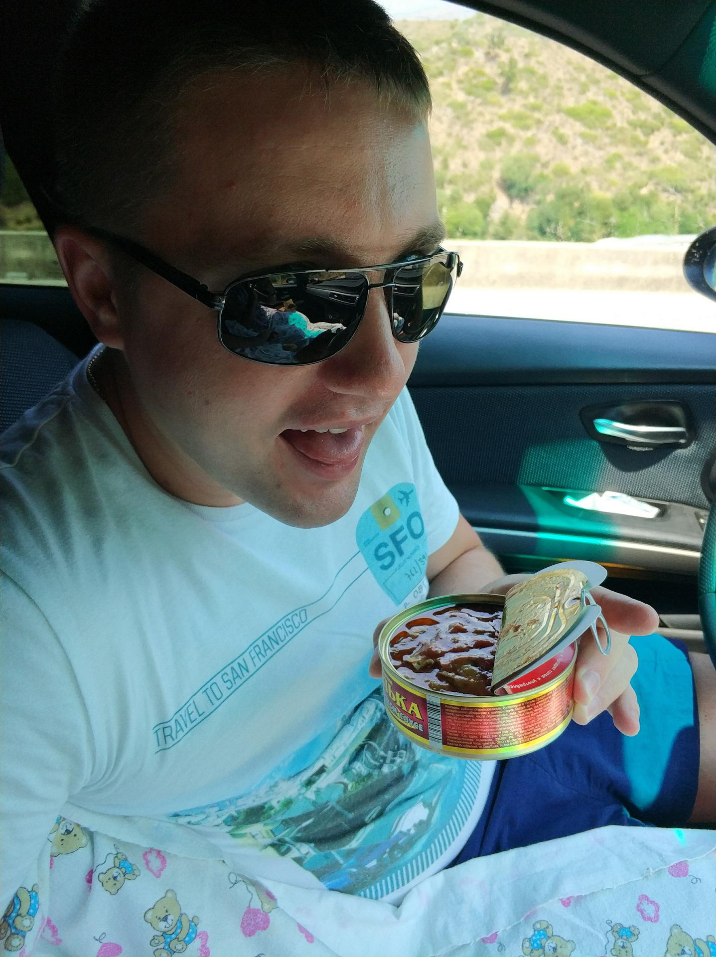 Довольные от того, что нам осталось ехать всего 60 км мы мчим на границу…и тут бах пробка…мы голодные…жарища на улице, и понимаем, что стоять часа 2( Опечаленные…достали НЗ -кильку в томате, благо дети не доели хлеб))) скатерть самобранка в машине и вот мы уже обедаем)))