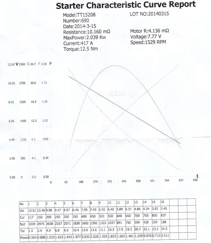 Максимальную мощность стартер развивает при 1530 об/мин и токе 417А при моменте примерно 12,2 Нм.