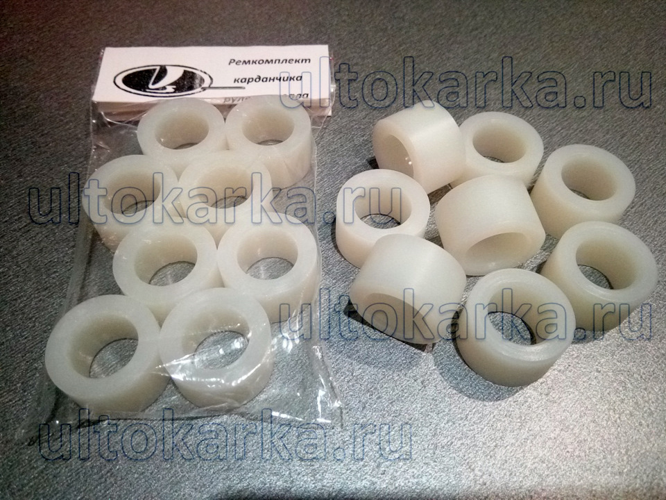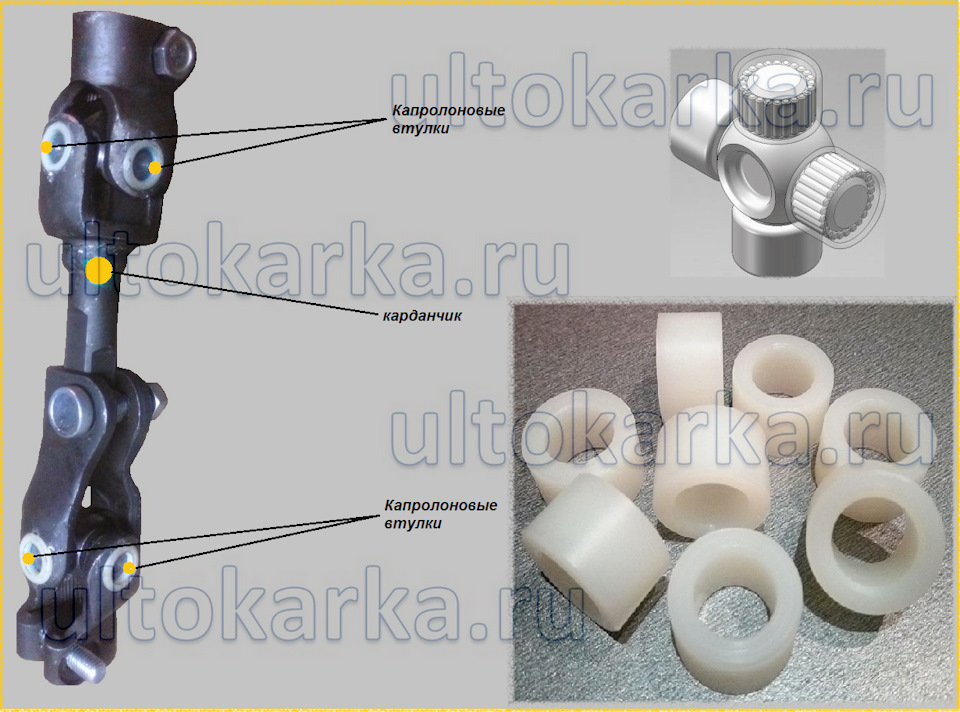 Вместо родной пластиковой втулки ставится усиленная, выточенная из капролактама. Она больше и прочнее штатной. В карданчиках тот же самый материал. Подшипники качения меняются на подшипники скольжения.