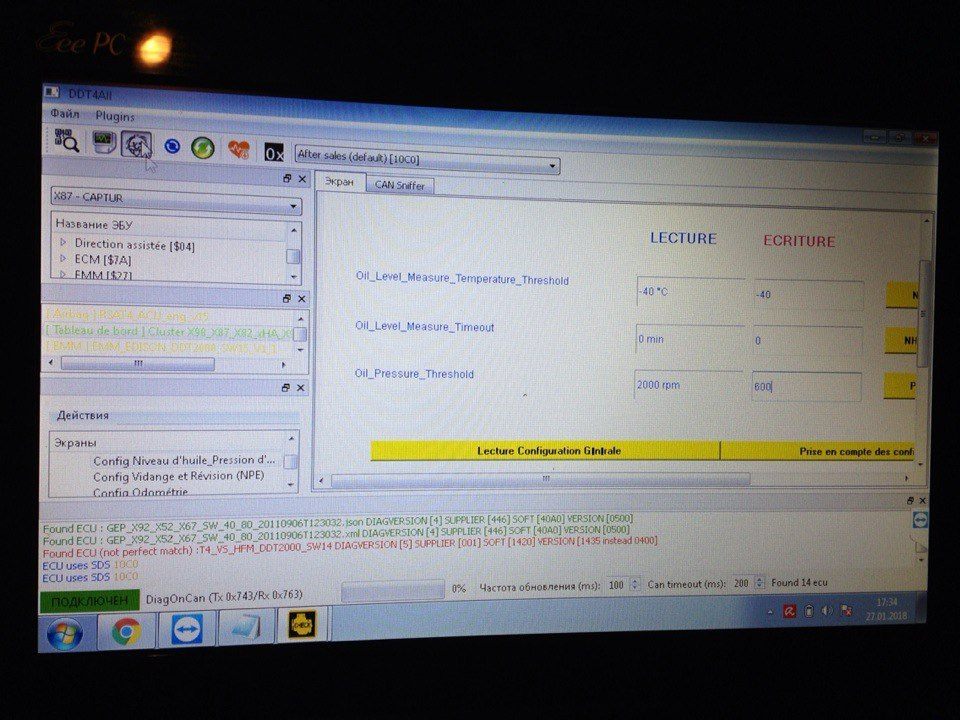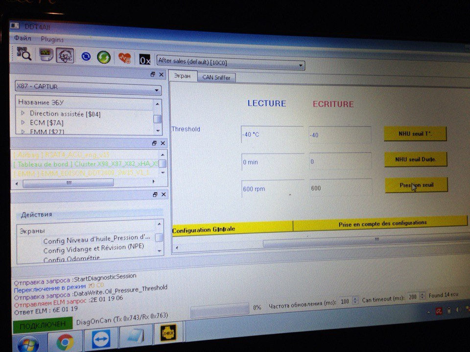 — снизить обороты с 2000 до 600 на включение датчика давления масла (т.к. Renaul Kaptur с двигателем 1.6, который может поджирать масло, поэтому лучше, чтобы датчик зажегся при запуске двигателя, а никогда поедешь и обороты перевалят за 2000 :)