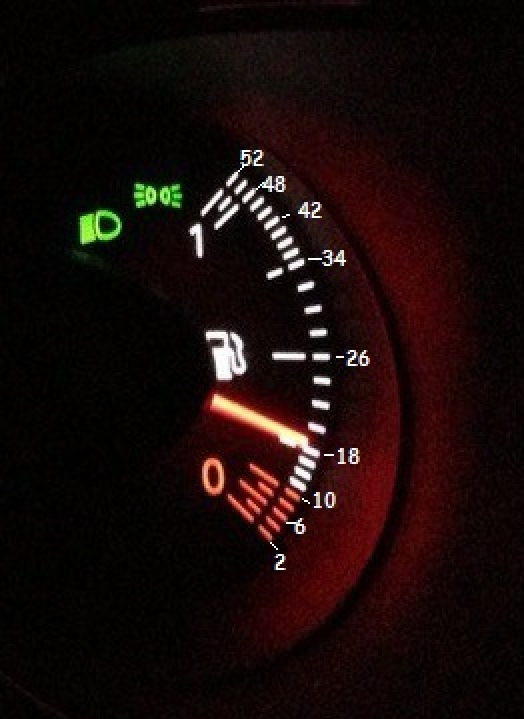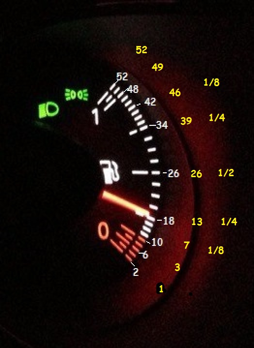 я тут посмотрел на эти рисочки в уровне бака, их получается всего 26 (снизу доверху), бак 52 литра, т.е. каждая риска отвечает за 2 литра бензина.