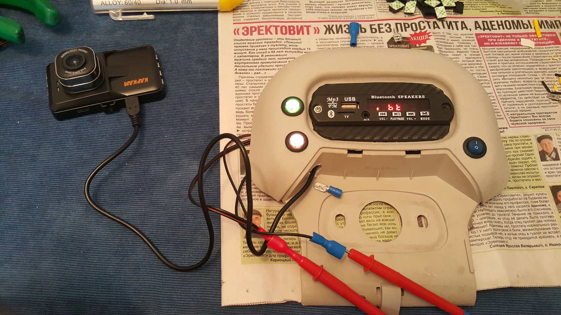 Я китайский мп3шник, с блюпупом, вкорячил. А магнитола старая, там джек 3,5 на ауксе, на морде выведен. Пришлось отслеживать дорожки, с панельки на плату, чтобы подпаяться и шнурок с *опы магнитолы вывести. Ненавижу провода снаружи!