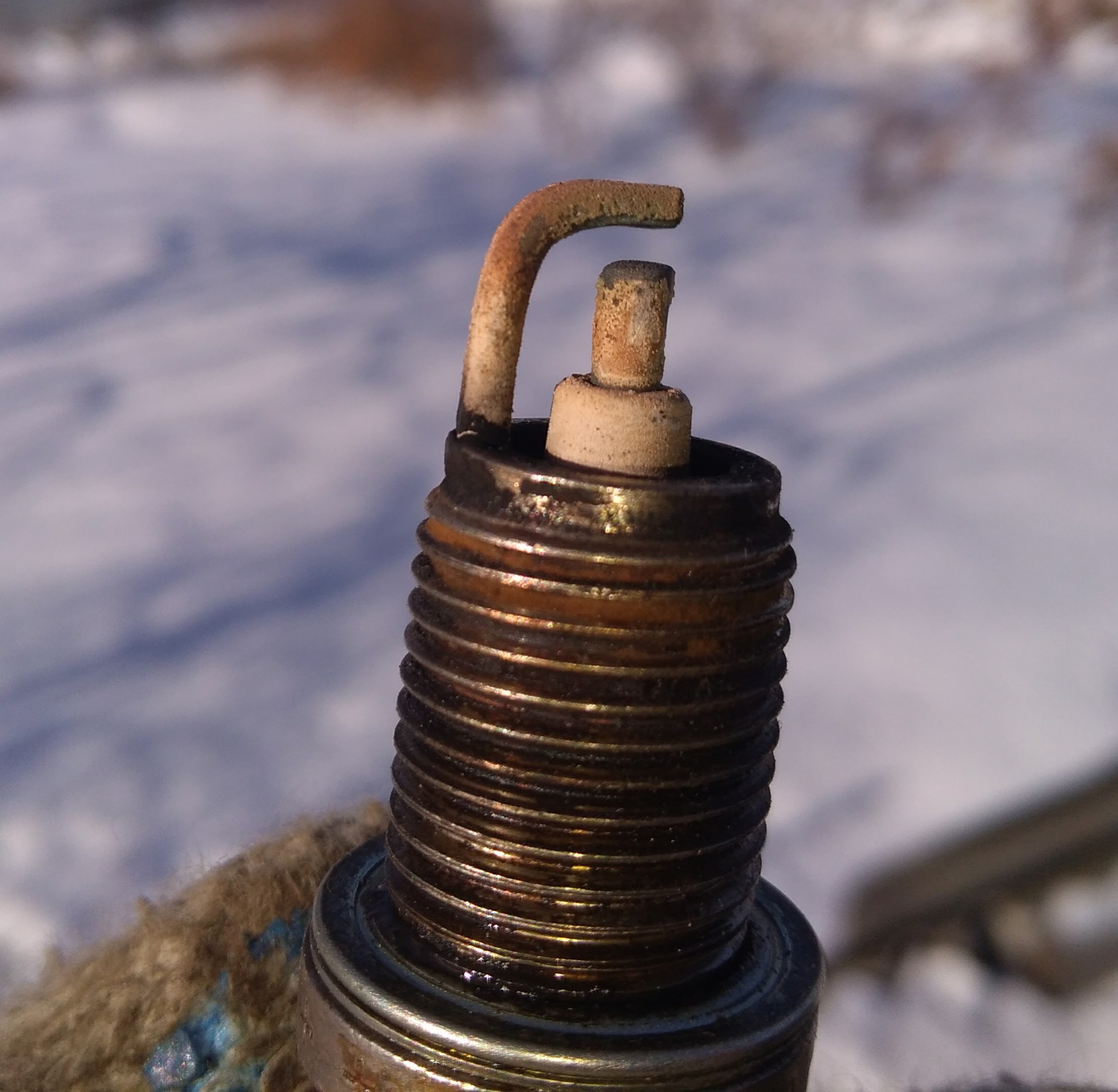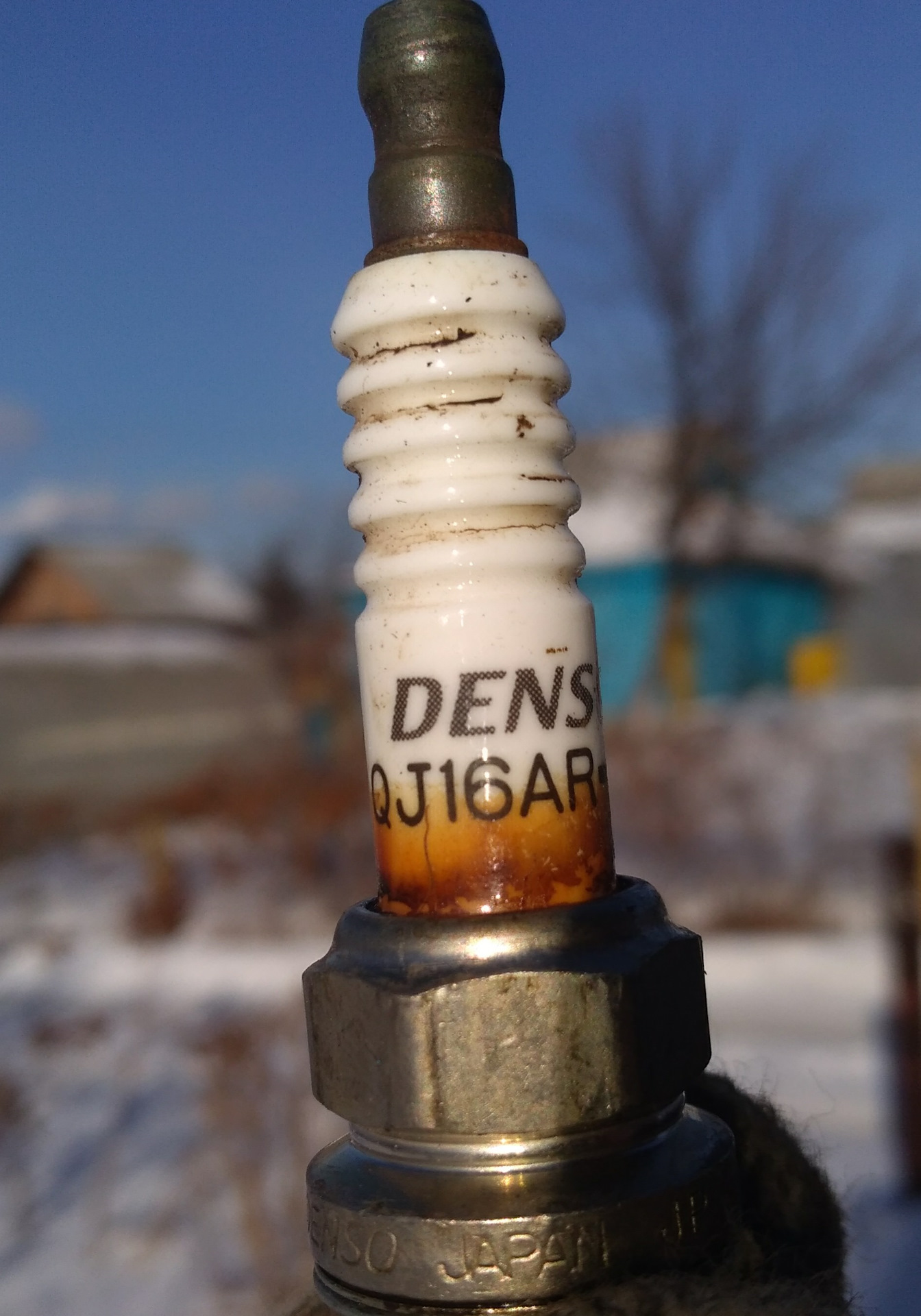 Состояние свечей печальное — юбка коричневая, черный нагар на электроде (правда сковыривается ногтем), да и сами свечи не бьются по каталогам для нашего движка — Denso QJ16AR-U11! интересный длинный электрод у них. Кстати, у меня на любых режимах работы движка программой Torque показывает долговременную топливную коррекцию -5,47%, может быть ссут форсунки и отсюда налет черный… буду наблюдать после замены свечей.