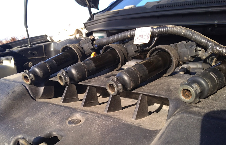 Заодно решил глянуть свечи. Вынул катушки — состояние наконечников хорошее, 3 цилиндр при сжатии есть небольшие трещинки. Все сухо. Порадовало что свечи выкручиваются обычным свечным-ключом трубкой на 16 (огромный привет Suzuki SX4, где мне очень пригодился свечной ключ тонкостенный обточенный на конус, который мастерил тесть для своей волги с крайслеровским движком).