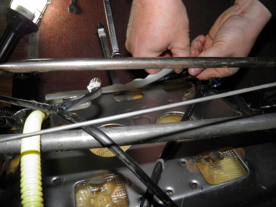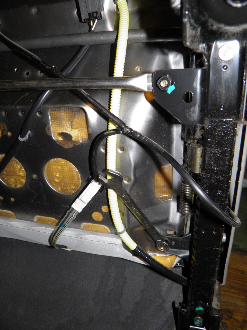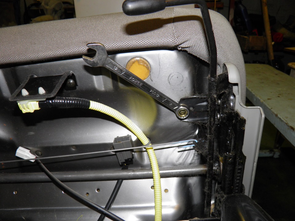 1. Ключем на 12 откручиваем 4 болта, крепящих металлическую основу сидушки к салазкам. Перед этим лучше отсоединить обогрев попы (разъем) и вытащить из металлической основы пистон с разъемом.