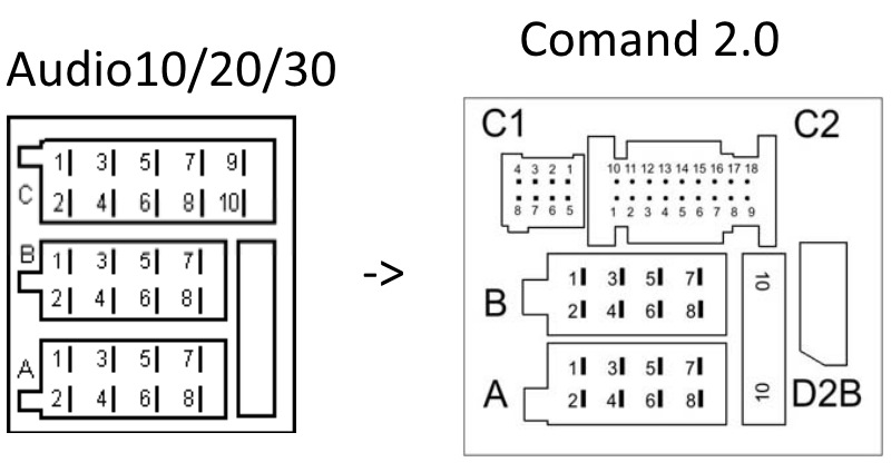 У Audio 10/20/30 есть фишка "С" на 10 пинов (она самая широкая, на схеме всё поймете) и она делится у Comand 2.0 на две фишки "C1" и "C2"