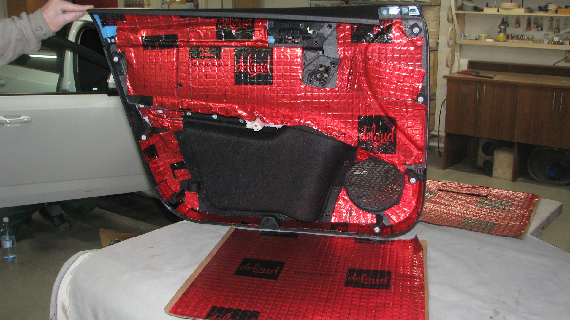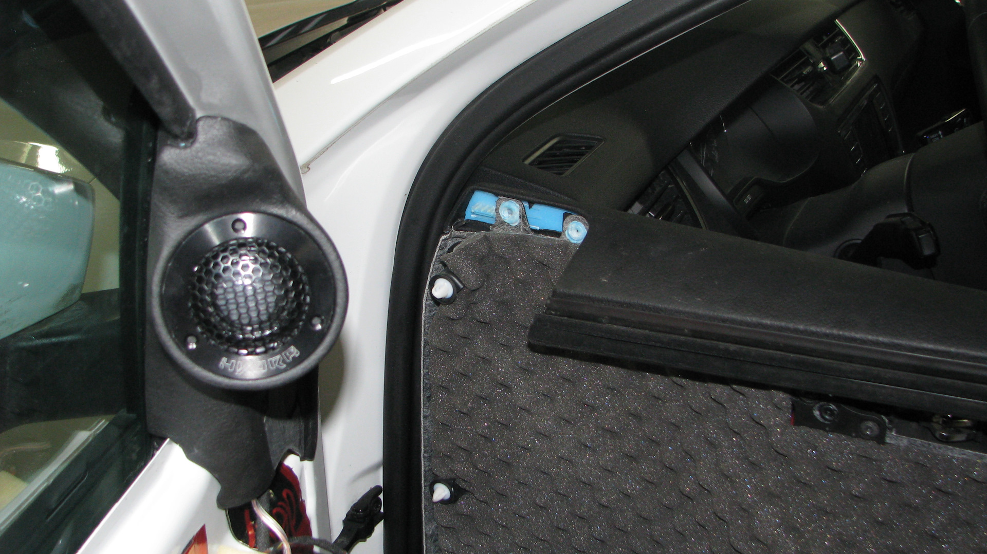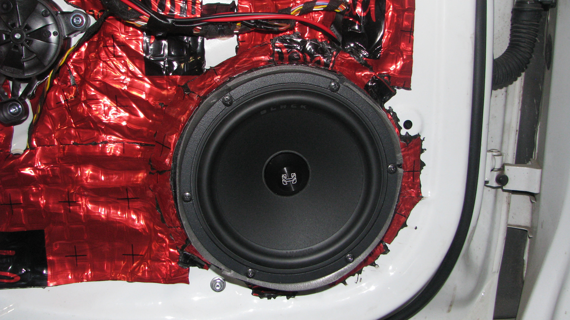 Цена очень приемлемая для динамиков играющих настоящий и качественный звук, инстал — копеешный поскольку (пока) без усилителей будут играть. Собственно по классической схеме, твитера в уголки дверей, а мидбасы по штатке, но конечно на жесткие проставки из фанеры. Не поканально (опять же это пока, т.к. головное устройство штатное) а через кросс. Шумка дверей естественно прилагается — тут мы выбрали лучшее что есть на рынке это премиум линейка материалов от компании Стандарт групп — Deloud с удивительно бескомпромиссным вариантом самой толстой фольги на материале 120 микрон — шумка в четыре слоя сняла все возможные вопросы по призвукам в звучании. Мы давно устанавливаем шумоизоляцию, но эффект от материала Демпфер — это что то за гранью возможного. Результат опять — максимально возможный.