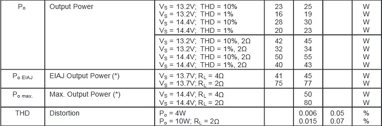 4 x 30W/4Ω@ 14.4V, 1KHz, 10%