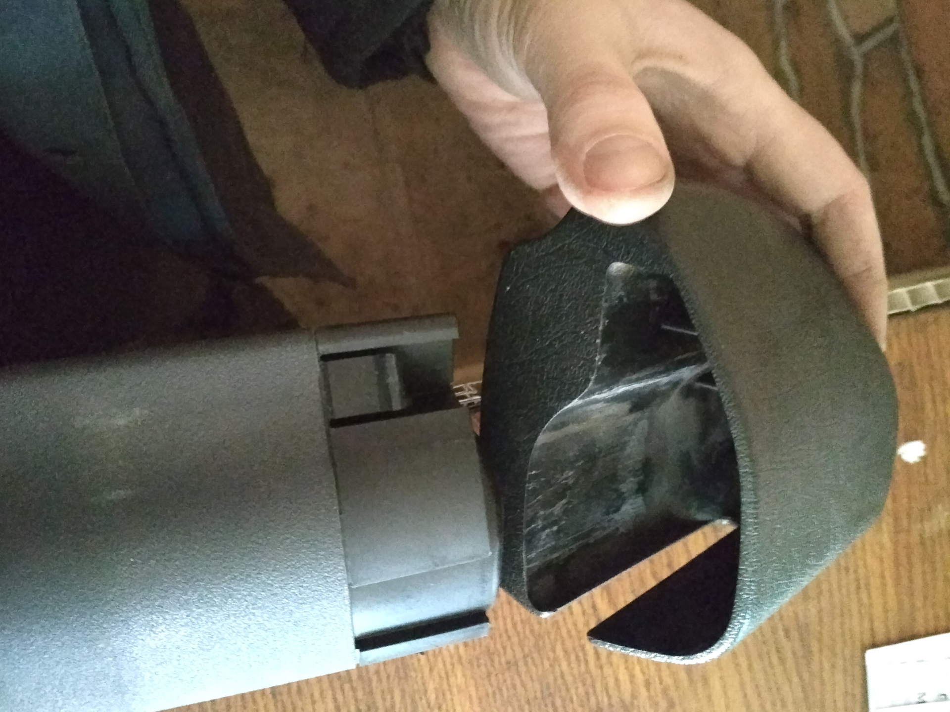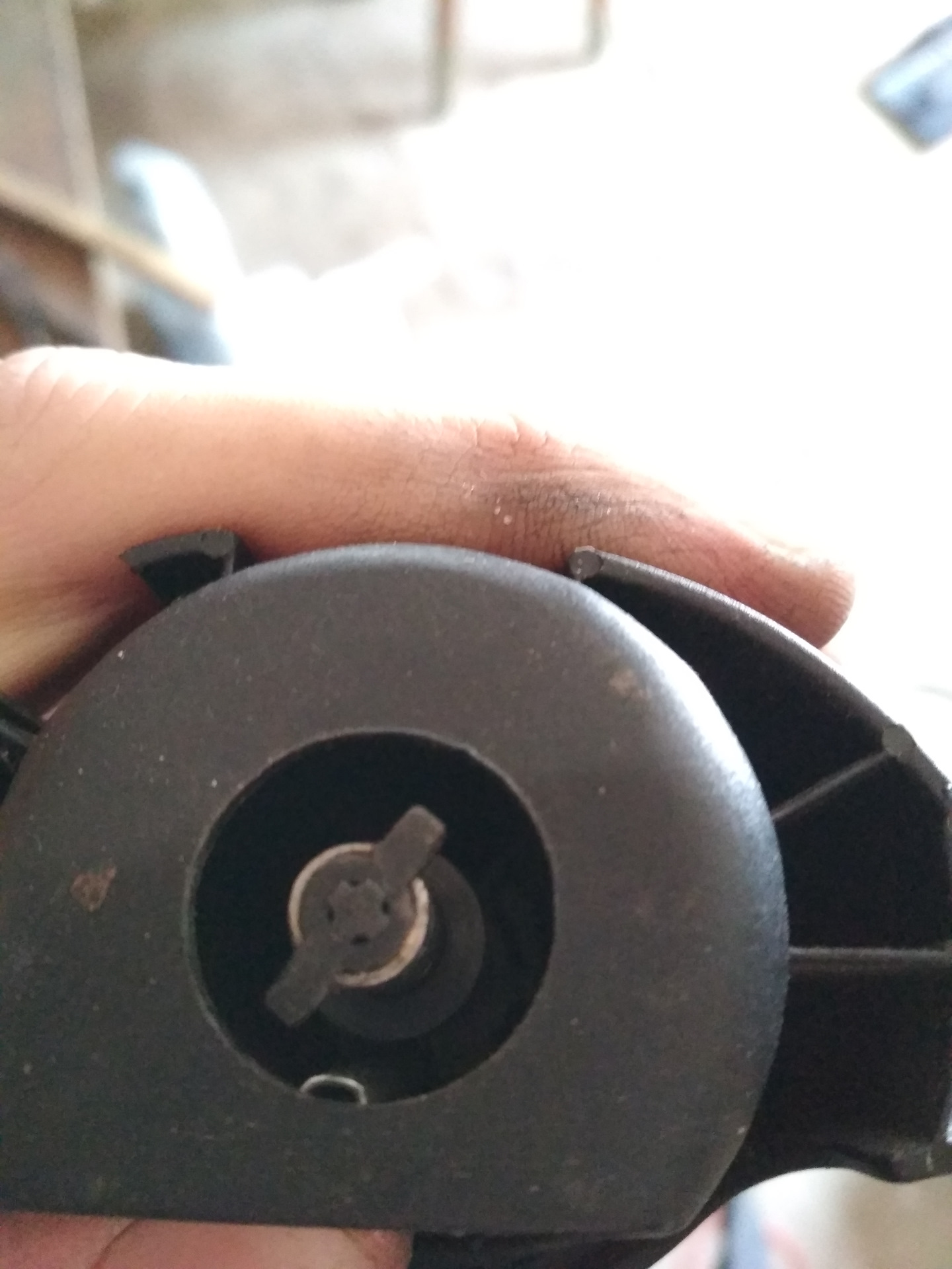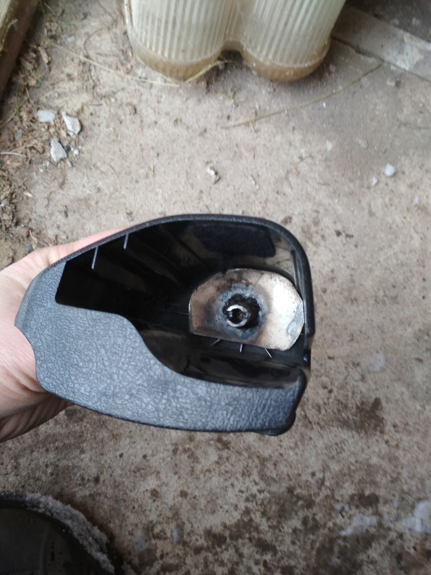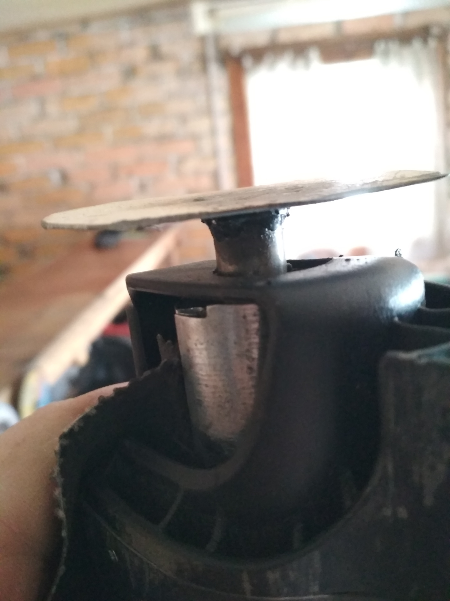 Это собственно то, что осталось от нормального крепления вала шторки, и что является корнем всей проблемы, т.е. по сути когда шторка развернулась пружина выпрямилась и, т.к. нет крепления ничто не возвращает штору на место, словами тяжело это передать значит к фото .