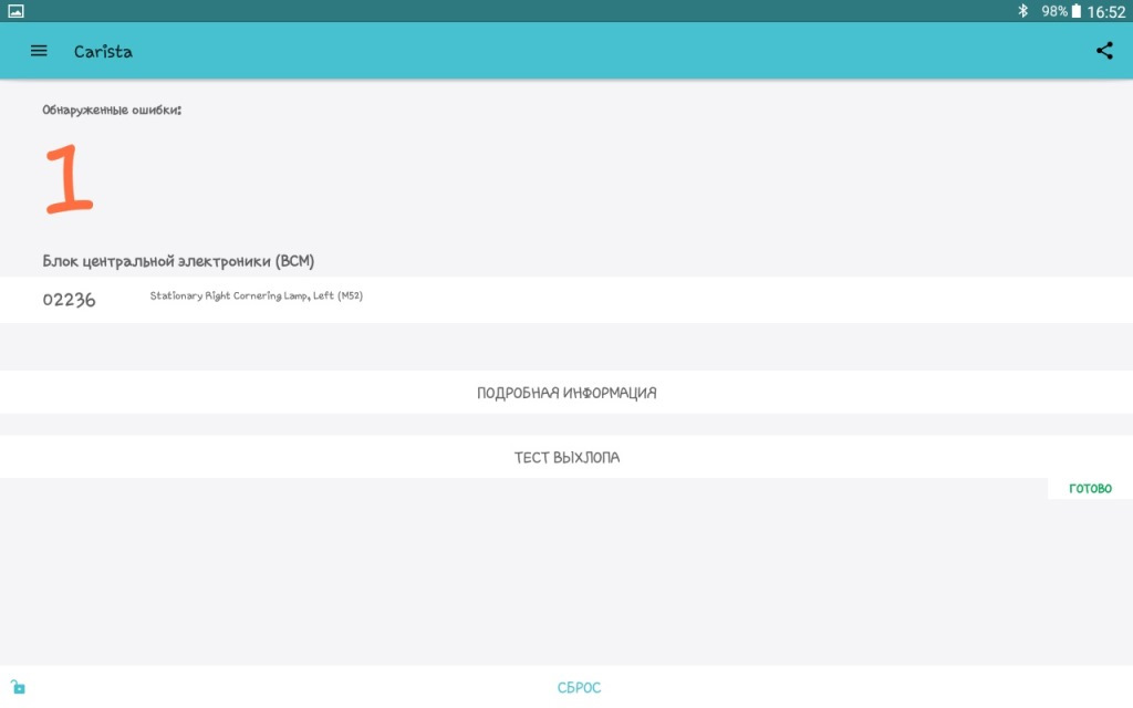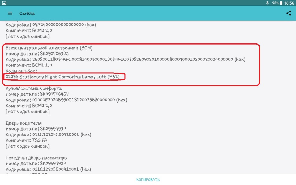 После того как поменял. Лампы не стали гореть, надо удалить ошибку. Для этого мне помог свисток ELM 327 и планшет SAMSUNG TAB 4 с прогой Carista