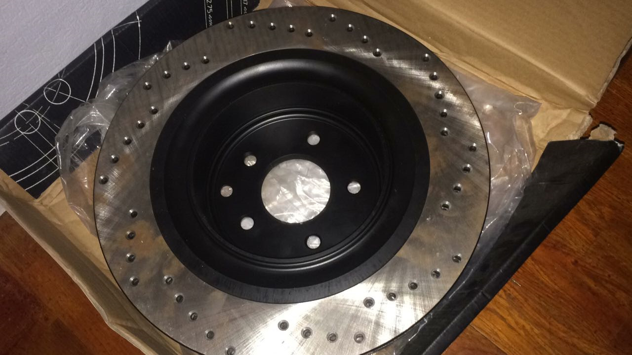 Ну а под такую дудку и задние диски надо бы поменять на что-то покрасивее (да да, тормозов мне с головой хватало, вопрос эстетики пошёл в ход))). Искал что есть за адекватные деньги и нарвался на новые диски StopTech, которые являются аналогом взамен моих (от большинства ниссанов с мотором VQ37VHR, где ручник 172мм)