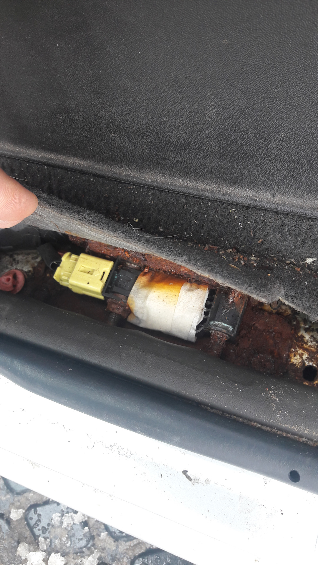 На всякий отключил массу с аккума, поднял частично пластик порога между водительской дверью и водительским сидением со стороны спинки сидения, головкой на 10 мм выкрутил 2 болта удерживающих крепежную пластину датчика, вытянул этот блок наружу, открутил тем же ключем на 10мм 2 гайки держущей датчик и скинул разьем.