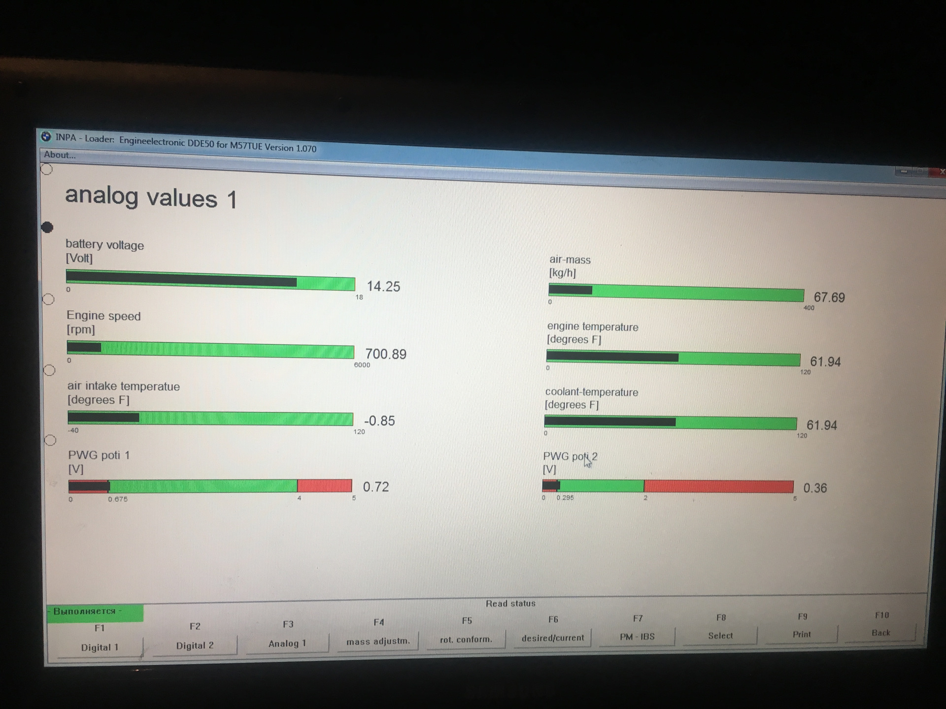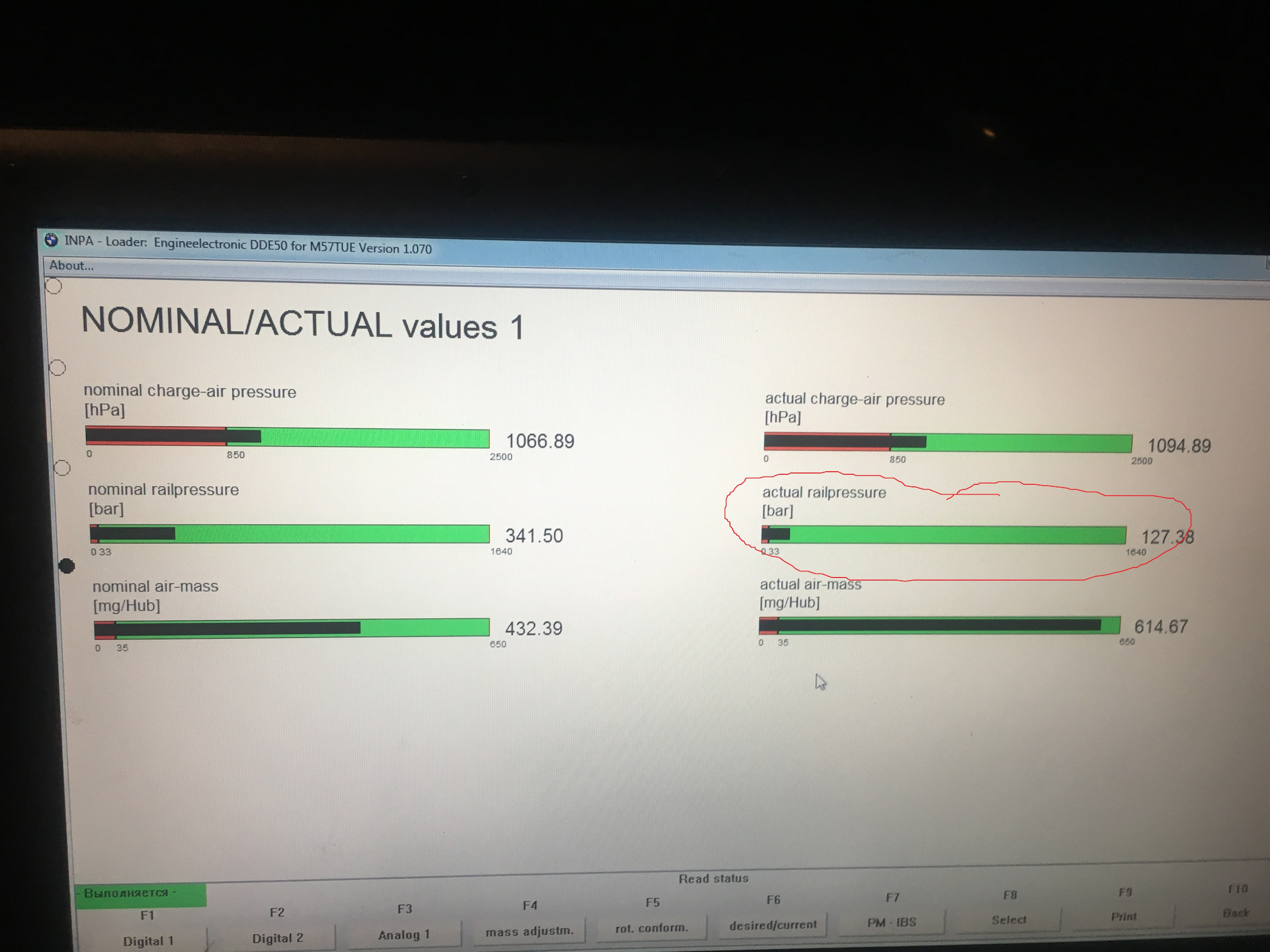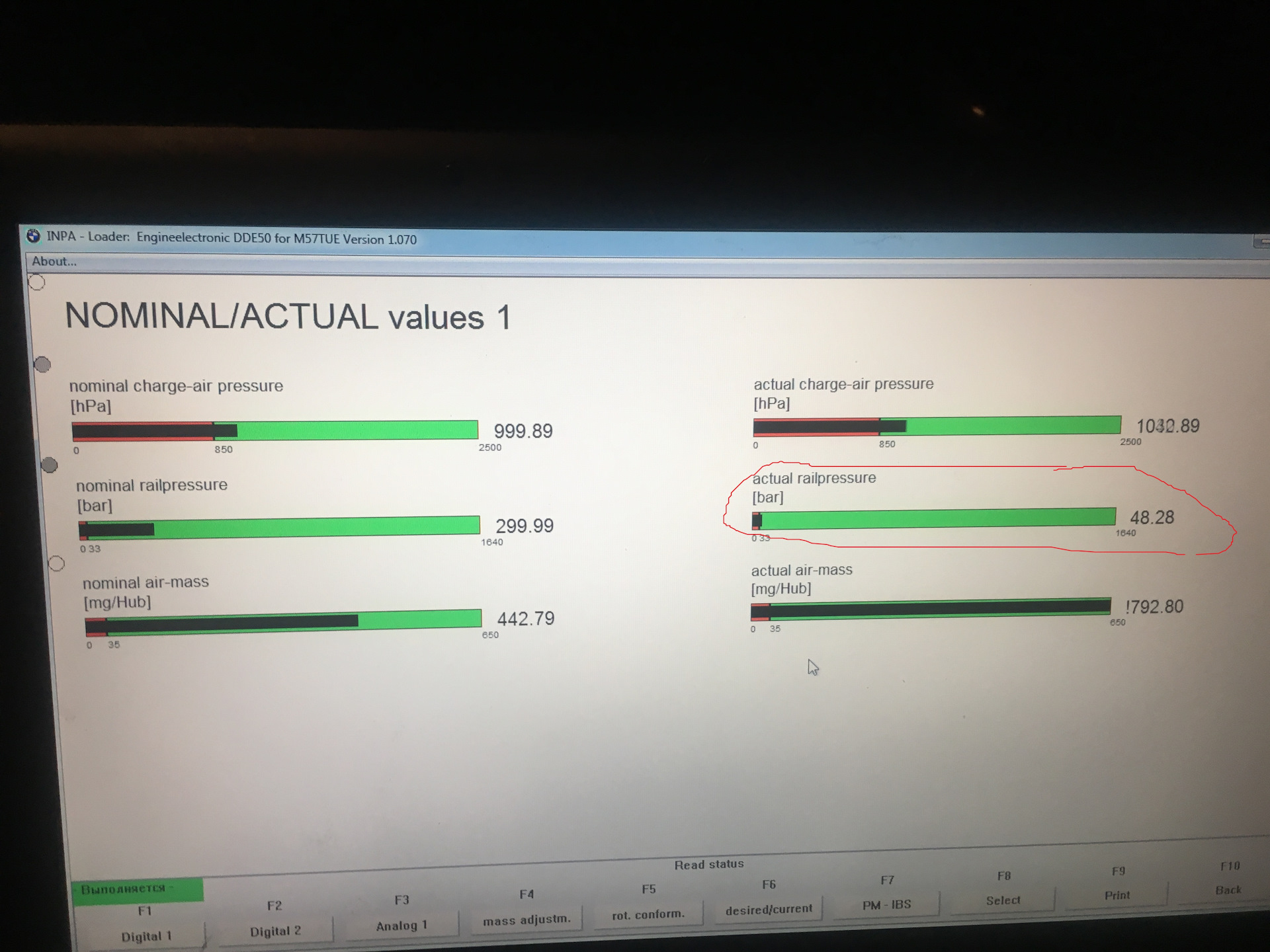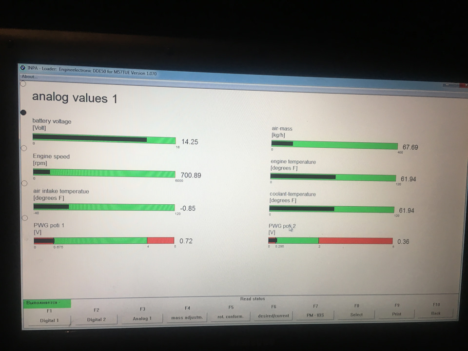 Так же есть еще другой вариант, не столь точный, но более простой, но у Вас по-ходу не сработает: найти с помощью диагностического сканера в данных работы реального времени параметр "Давление подкачивающего насоса" или "Pre-supply pressure". Но как писал выше, в Вашем конфиге INPA этого параметра нет, тут может помочь ISTA-D, благо она так же прекрасно работает с Вашим K-DCAN'ом. Ну или лезть и ковырять конфиги INPA (DIS'ом не пользуюсь ибо он старый и крайне тормозной, того и не советую). Выбор небольшой, если хочется своими силами этот вариант осилить, хотя первый будет предпочтительнее т.к. манометр напрямую и более чутко реагирует на давление нежели чем датчик-АЦП-контроллеры-конвертор-софт.