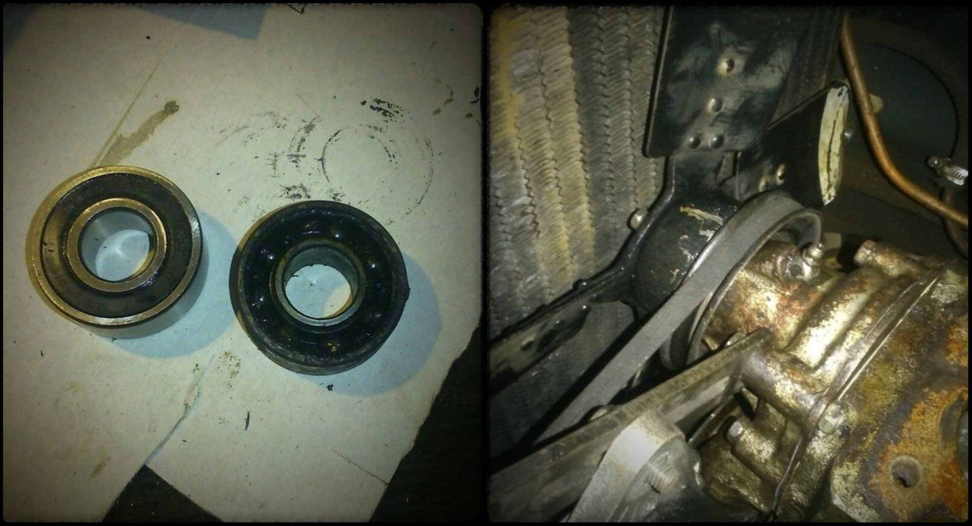 Снятая головка уехала на омолаживающие процедуры (ребята юзают аутсорсинг, ага), а тем временем была снята и перебрана водяная помпа. У меня никаких претензий к ней не было (кроме того, что корпус позднего образца), но, опять же, вскрытие показало смерть подшипника. Он был заменен, а помпа собрана в раннем корпусе с возможностью шприцевания.