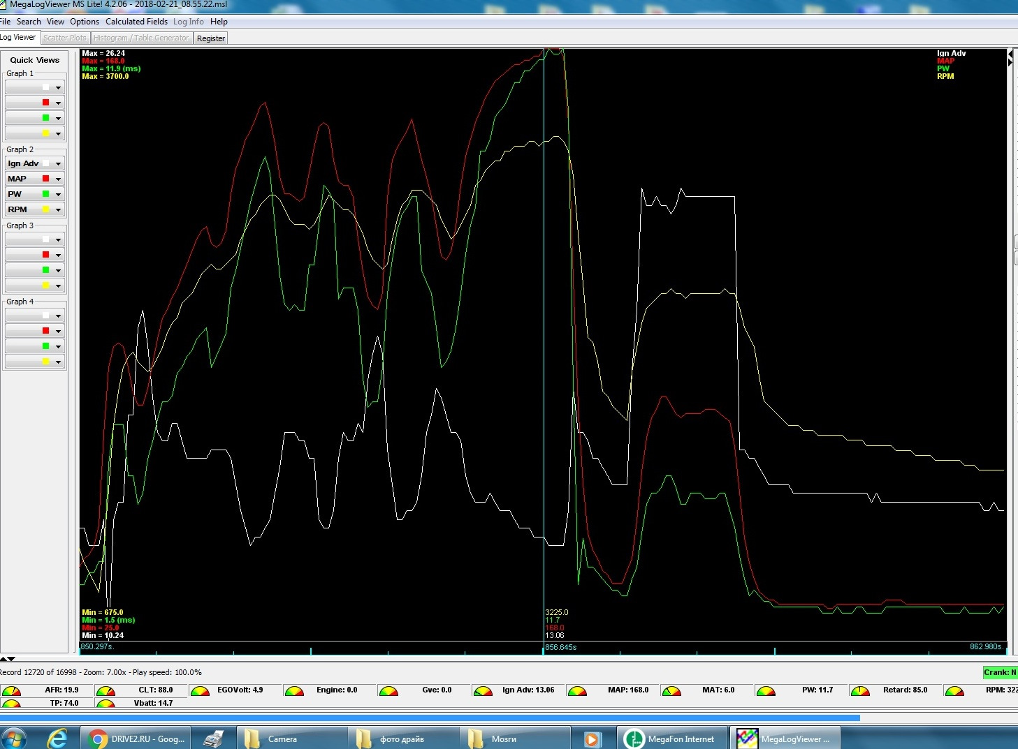 Для датчиков в Тюнер студии, подобрали характеристики термосенсора и мап сенсора. Вкратце для показания давления на впуске (МАПа) была рассчитана формула с коэффициентами, по которым Тюнер студия пересчитывает и отображает на экране.