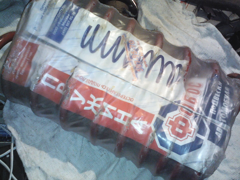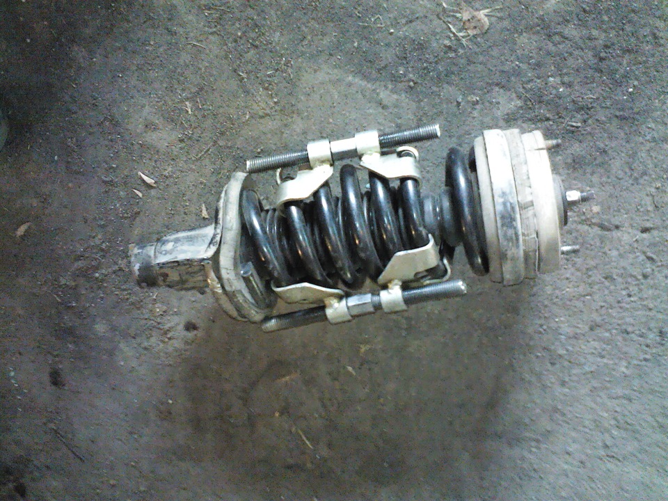 По советам форумчан нужно отпилить от Волгопружин толи по полтора, толи по одному витку, я же выбрал среднее и отпилил по 1,25 витка от каждой из пружин. По совету некоторых устанавливать пружины с переменным шагом нужно именно частью с частым шагом вверх, так я и сделал. Сжимал их стяжками для пружин четырёхлапыми и то с трудом, два раза пружины выстреливали по причине невыдерживания стяжек, пришлось их(стяжки)усиливать навариванием и закаливанием, под страхом остаться без гляделок и хваталок пружины были всё же внедрены на свои законные места. Не могу не описать очередной мой "затупон" (наверное из-за пива), отпускаю машину с домкрата, когда уже обе стороны собраны, а подвеска ни на сантиметр не сдаёт, вот, думаю, попадос, мало отпилил, теперь как на телеге передвигаться буду. Сижу репу чешу,